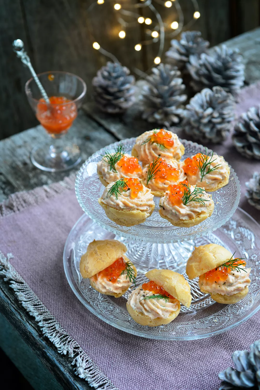 Luchtige hartige soezen gevuld met romige zalmmousse zijn perfect als feestelijke borrelhap of verfijnd voorgerecht. De mousse van gerookte zalm, mascarpone, room en een vleugje citroen en dille wordt met een spuitzak gespoten voor een elegante presentatie. Afgewerkt met zalmeitjes en extra dille bieden ze een frisse lenteachtige smaak en een luxe touch voor elke speciale gelegenheid.