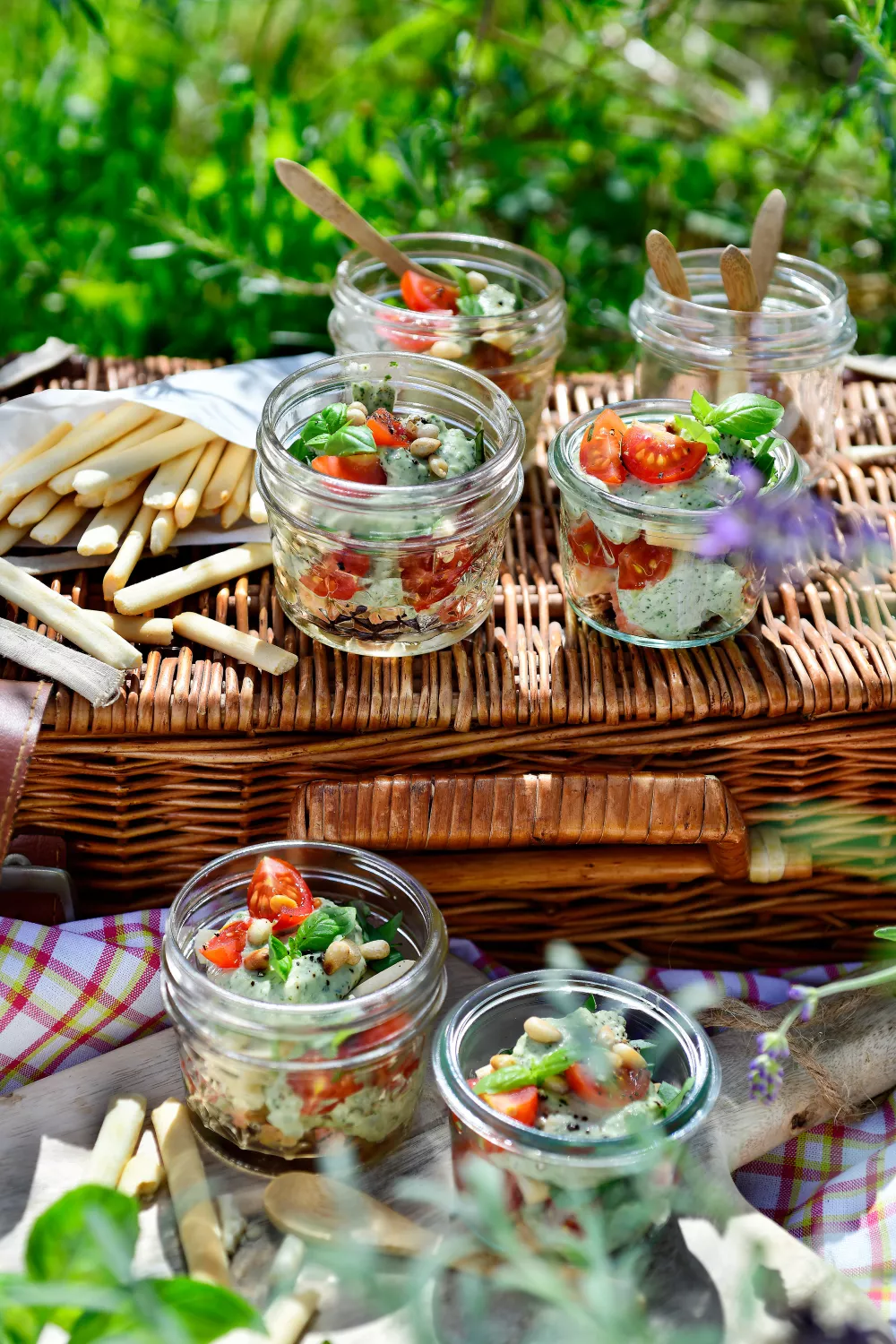 Lichte hartige tiramisu in glaasjes met romige mascarpone, verse basilicum en zoute Parmezaan, afgewisseld met krokante grissini en sappige kerstomaatjes. Het eiwit wordt luchtig geklopt en de basilicumroom in de foodprocessor fijn gemengd zodat je een zijdezachte mousse krijgt die je laag voor laag opbouwt. Perfect als zomerse borrelhap of fris voorgerecht bij een informele lunch.