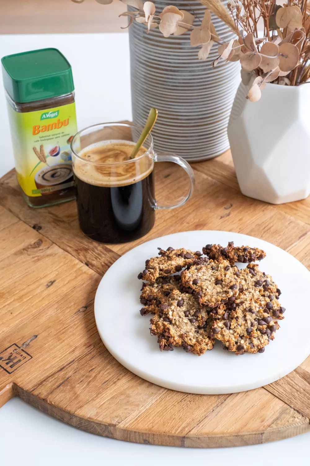 Maak bolletjes van het beslag en druk ze plat op een bakplaat met bakpapier. Schuif in de oven gedurende 12 minuten. Laat even afkoelen terwijl je een heerlijke kop Bambu, een natuurlijk alternatief voor koffie zonder cafeïne, zet voor erbij.