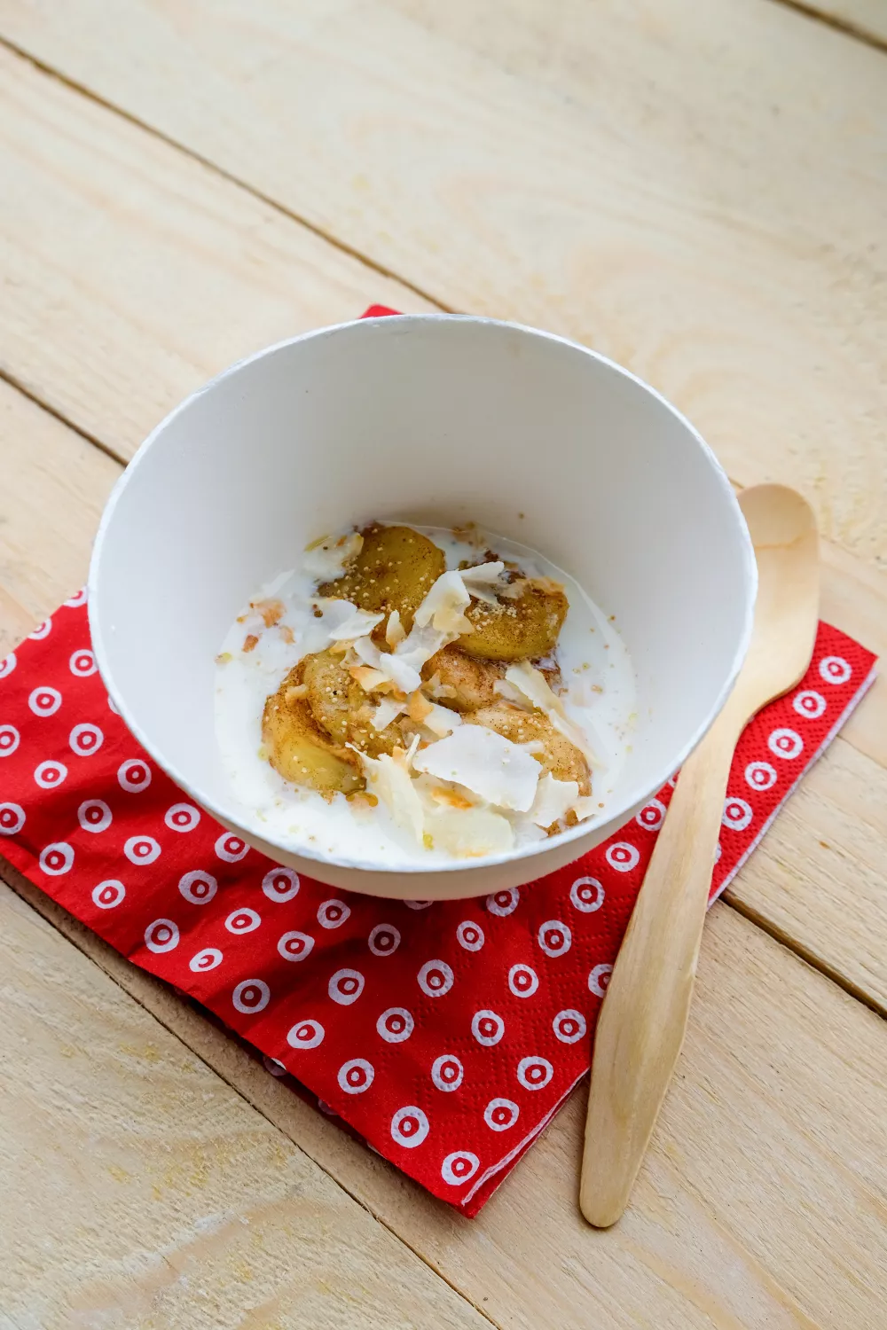 Verdeel de havermoutpap over verschillende bordjes. Werk af met de stukjes banaan en de geroosterde kokosschilfers.