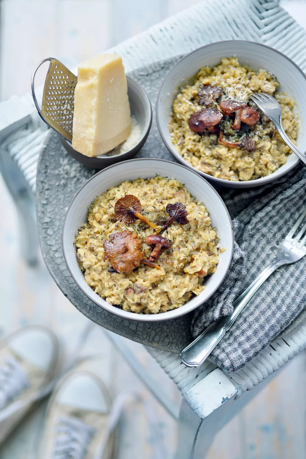 Deze romige havermoutrisotto combineert zachte havervlokken met kastanjechampignons, shiitakes en beukenzwammen voor een rijke umamismaak. Door de havervlokken langzaam te laten sudderen in kippenbouillon of groentebouillon krijgt het gerecht een risottoachtige, smeuïge textuur, op smaak gebracht met Parmezaanse kaas en tijm. Perfect als warm herfstgerecht of snelle, voedzame avondmaaltijd die makkelijk vegetarisch en glutenvrij blijft.