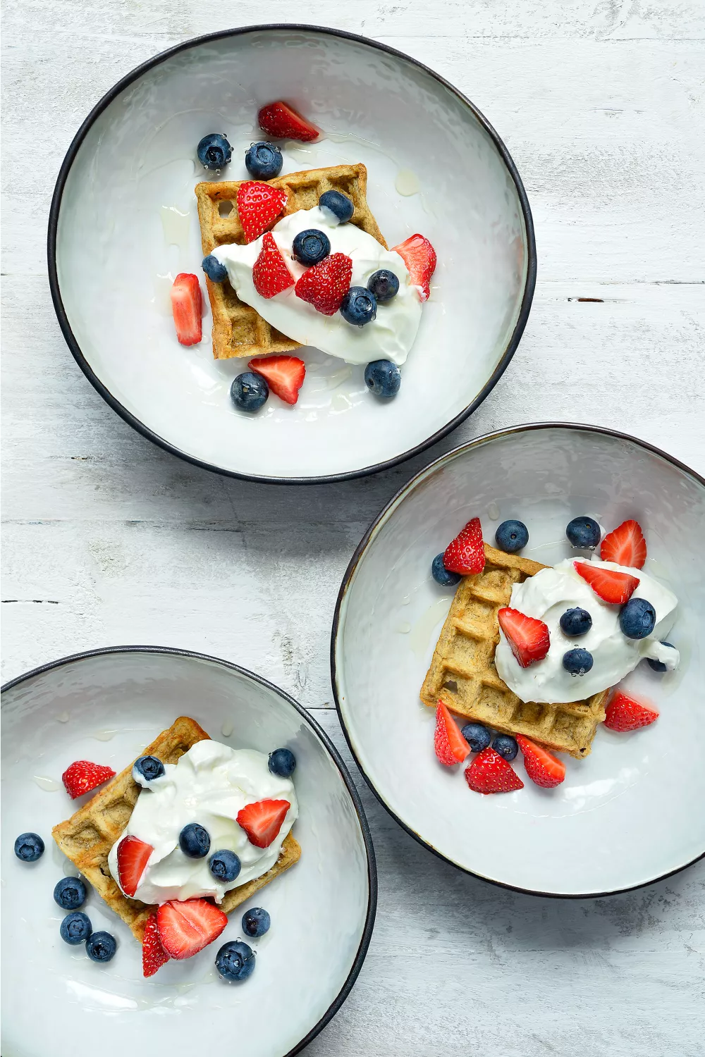 Serveer de wafels met de Griekse yoghurt en enkele stukjes vers fruit.