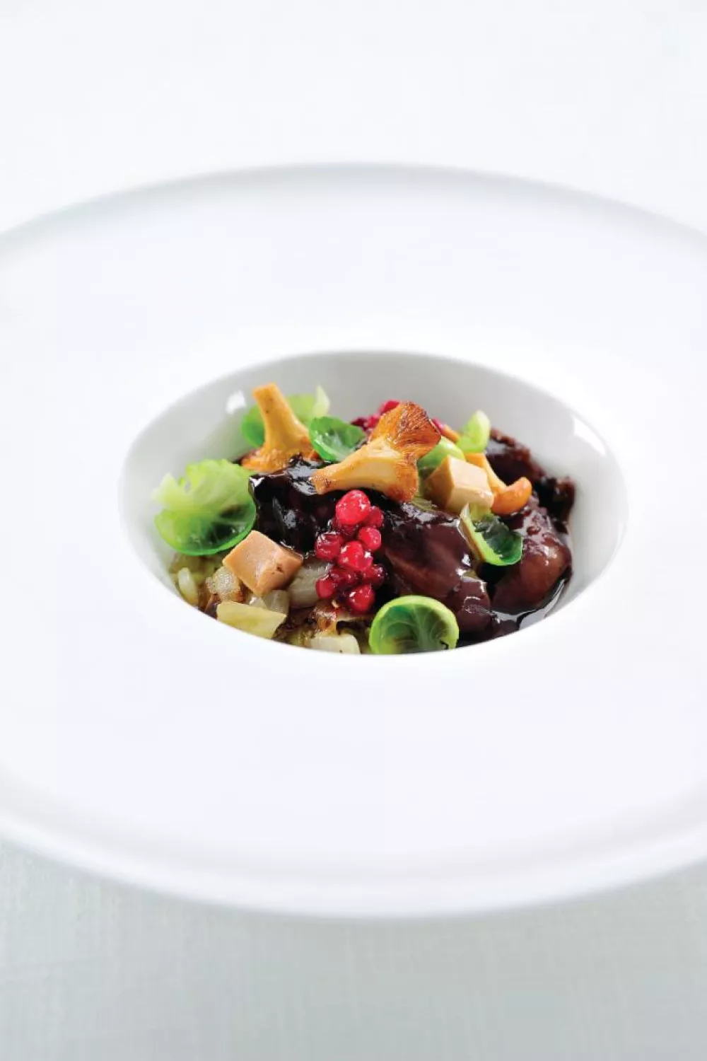 Neem een diep bord en leg er een lepel van het gestoofde witloof in. Schep hier bovenop de hazenpeper, de girollen en de spruitjes. Werk af de veenbessen en de blokjes ganzenlever.