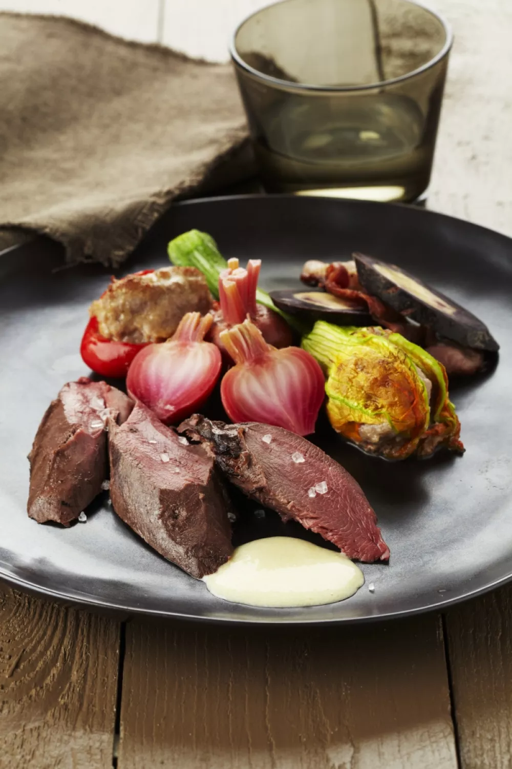 Hazenrug met herfstgroenten en mierikswortelsaus