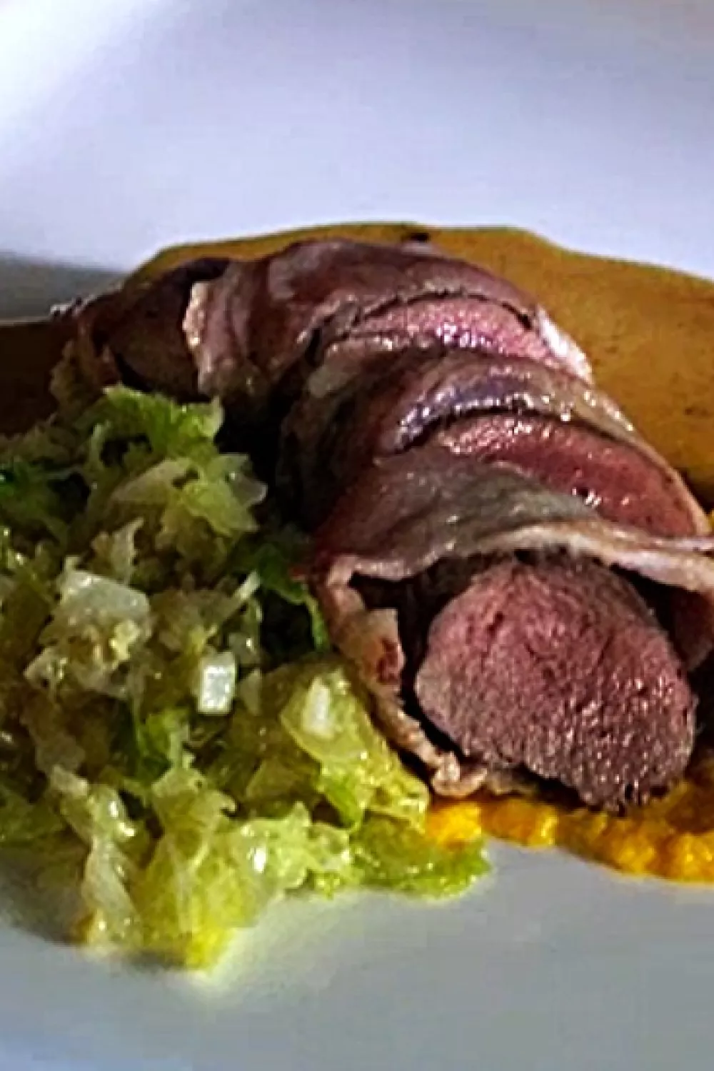 Robuuste hazenrug met romige wortelzalf en smeuïge groene kool op fijn gesneden spek is een feestelijk herfstgerecht waarin wild, porto en warme specerijen samenkomen. De filets worden kort geschroeid en in spek gewikkeld, de jus wordt ingekookt met porto en wildfond. Perfect voor een gezellig diner of speciale wintermaaltijd.