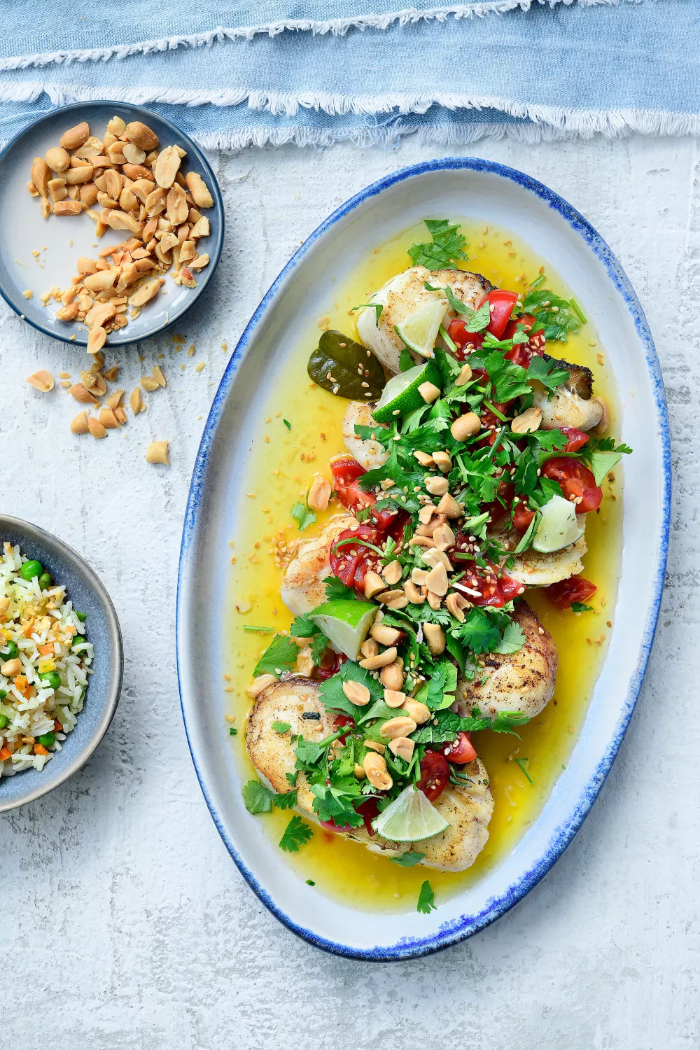 Haal de stukken vis uit de oven en leg ze op een mooie, grote schaal. Lepel er de saus over. Werk af met munt, koriander, kerstomaatjes, pinda, limoen en sesamzaadjes. Serveer met rijst of noedels.