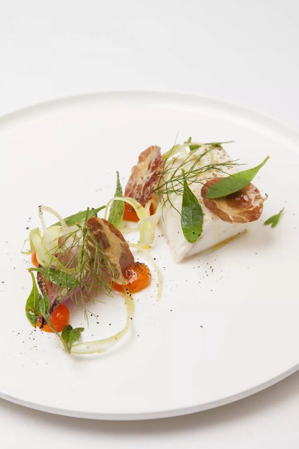 Heilbot met geglaceerd eigeel en krokante Coppa combineert malse witvis met een zijdezacht, langzaam gegaard eigeel en knapperige Italiaanse ham. De vis wordt goudbruin gebakken en met boter begoten terwijl verkoolde bosui, geschaafde venkel en frisse zeepostelein voor een verfijnde, lichtzure tegenhanger zorgen. Een elegant visgerecht dat perfect past bij een feestelijk diner of een speciaal seizoensmaal.