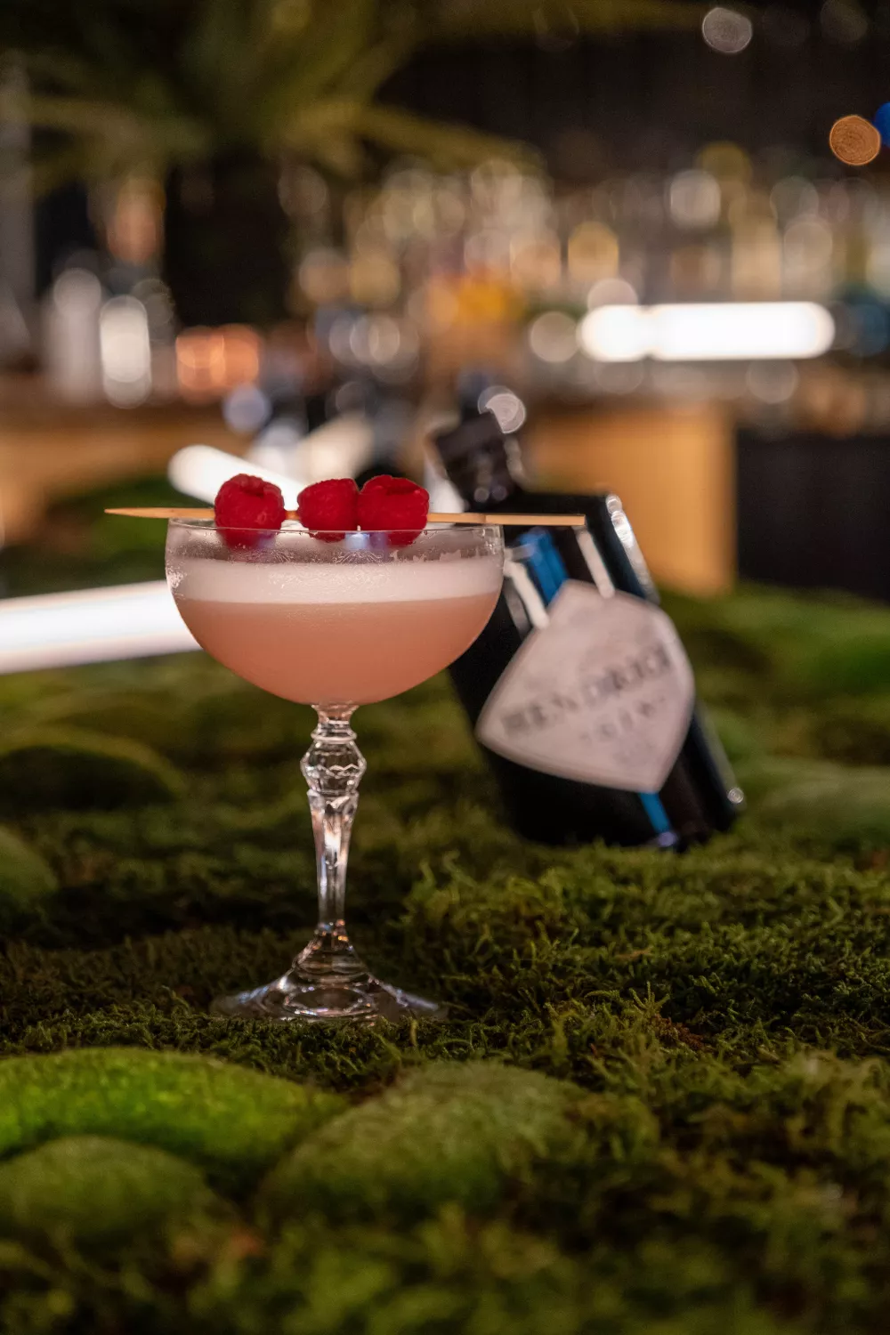 Start met het coupetteglas voor te koelen met een laagje ijs. Neem een shaker en voeg er 5 centiliter Hendrick’s gin aan toe. Dan mag er ook 2 centiliter vers geperst limoensap, 2 centiliter frambozensiroop en een eiwit bij. Shake alles krachtig. Voeg daarna ijsblokjes toe om de cocktail te koelen en shake opnieuw krachtig.