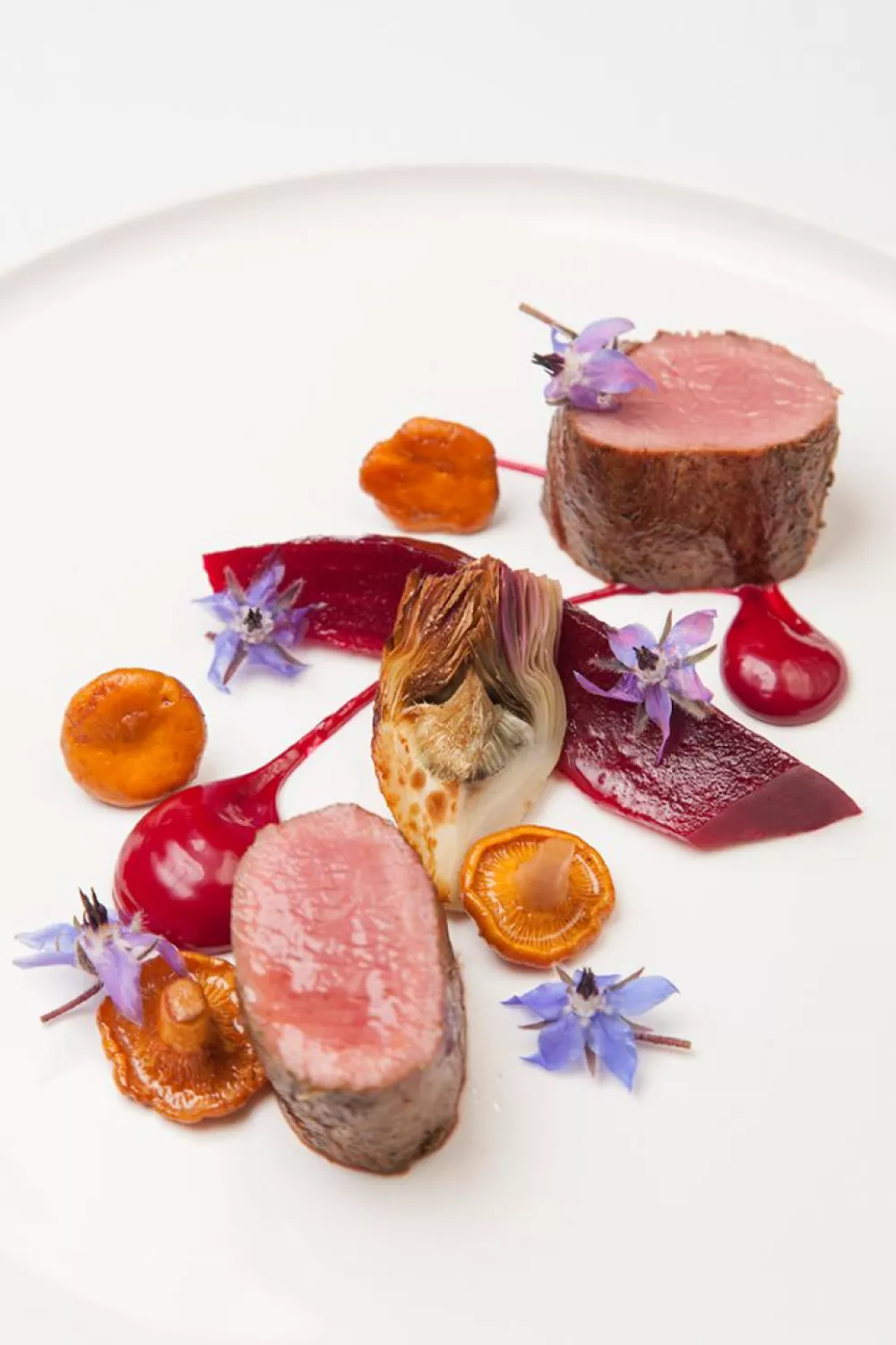 Voor de opmaak op het bord: begin met de bieten-aioli. Snijdt het lamsvlees in vier porties, waarbij je twee stukken op elk bord legt. Garneer het met de biet, artisjok en girolles. Werk het af met de bernagie-bloemen.