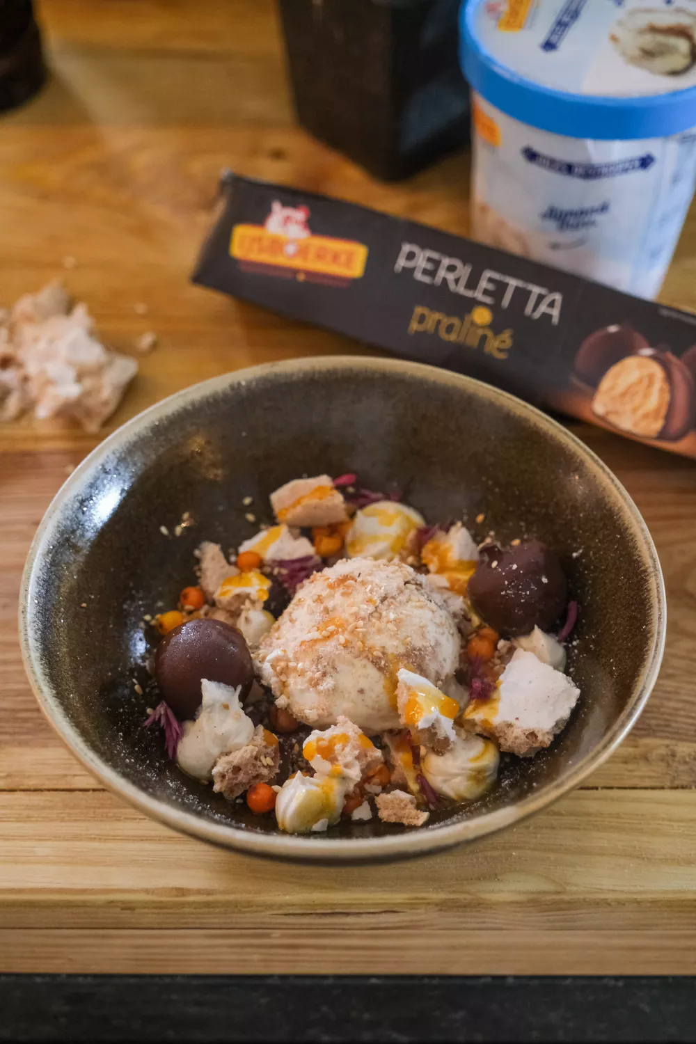 Schep een lepeltje kastanjecrème op de bodem van elk kommetje. Schep er een bol Almond Thins ijs op. Verkruimel de mergingue over het ijs. Werk de kommetjes af met stukjes kastanje, toefjes van de mascarponecrème, het sausje van duindoornbes, sesamzaadjes, enkele duindoornbesjes en een ijspraline.