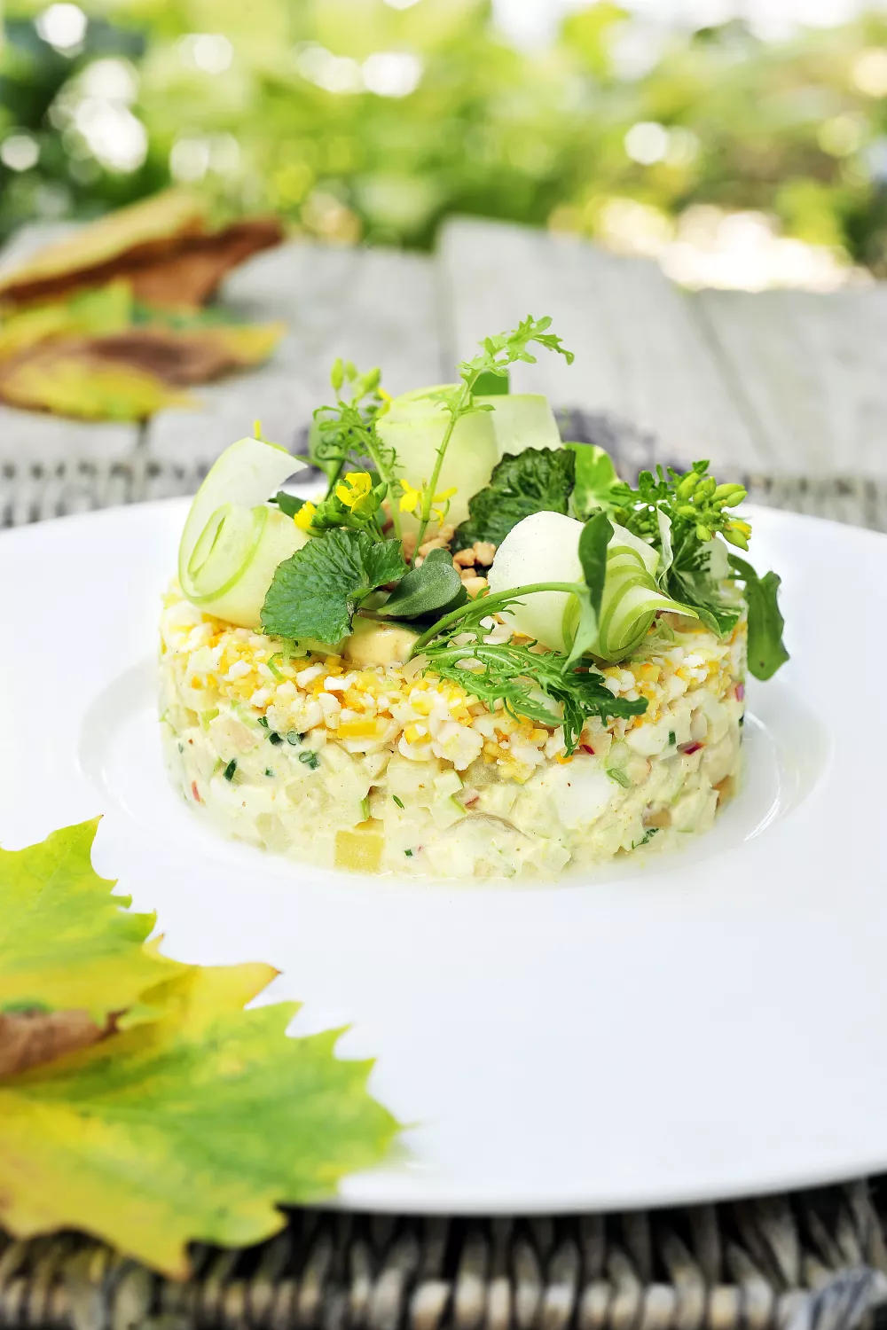 Deze herfstsalade combineert zachte mozzarella met frisse stukjes appel en peer, knapperige pijnboompitjes en een romige dressing van mayonaise en Griekse yoghurt. Gekookte blokjes aardappel vormen de basis, terwijl rauwe courgette, bloemkool en een vleugje gember voor textuur en pit zorgen. Opgebouwd in een kookring geeft dit gerecht een feestelijke, seizoensgebonden touch als lunch, bijgerecht of borrelhap.