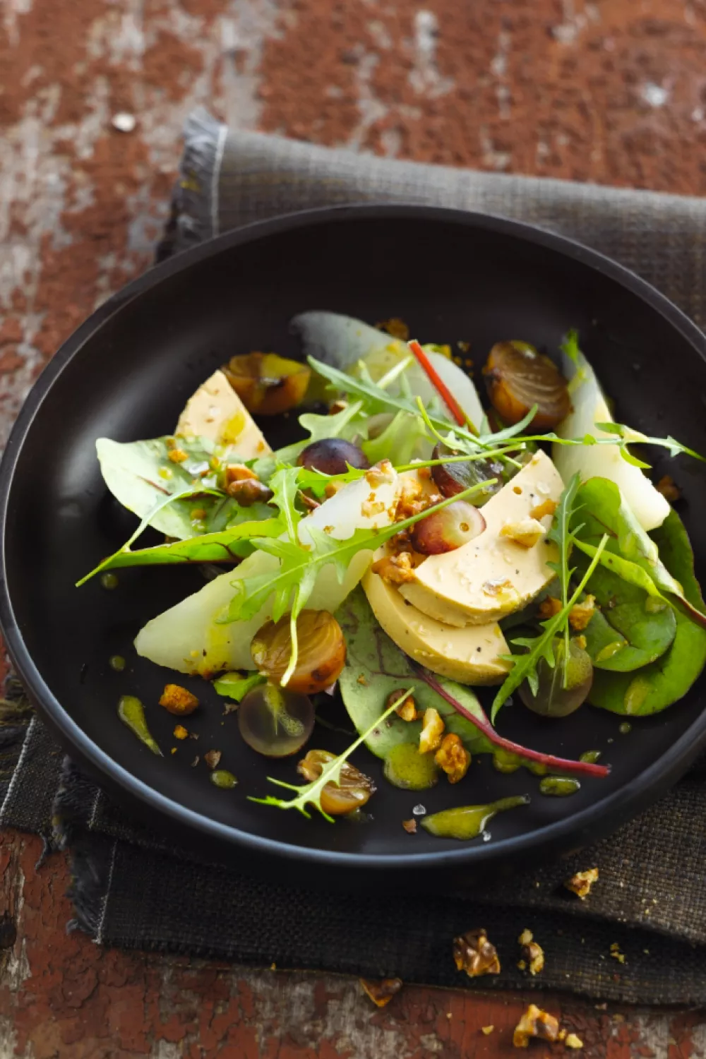 Meng in een grote schaal de salade, peren, druiven, uitjes en de gehakte walnoten. Serveer met een schijfje foie gras of faux gras en de dressing.