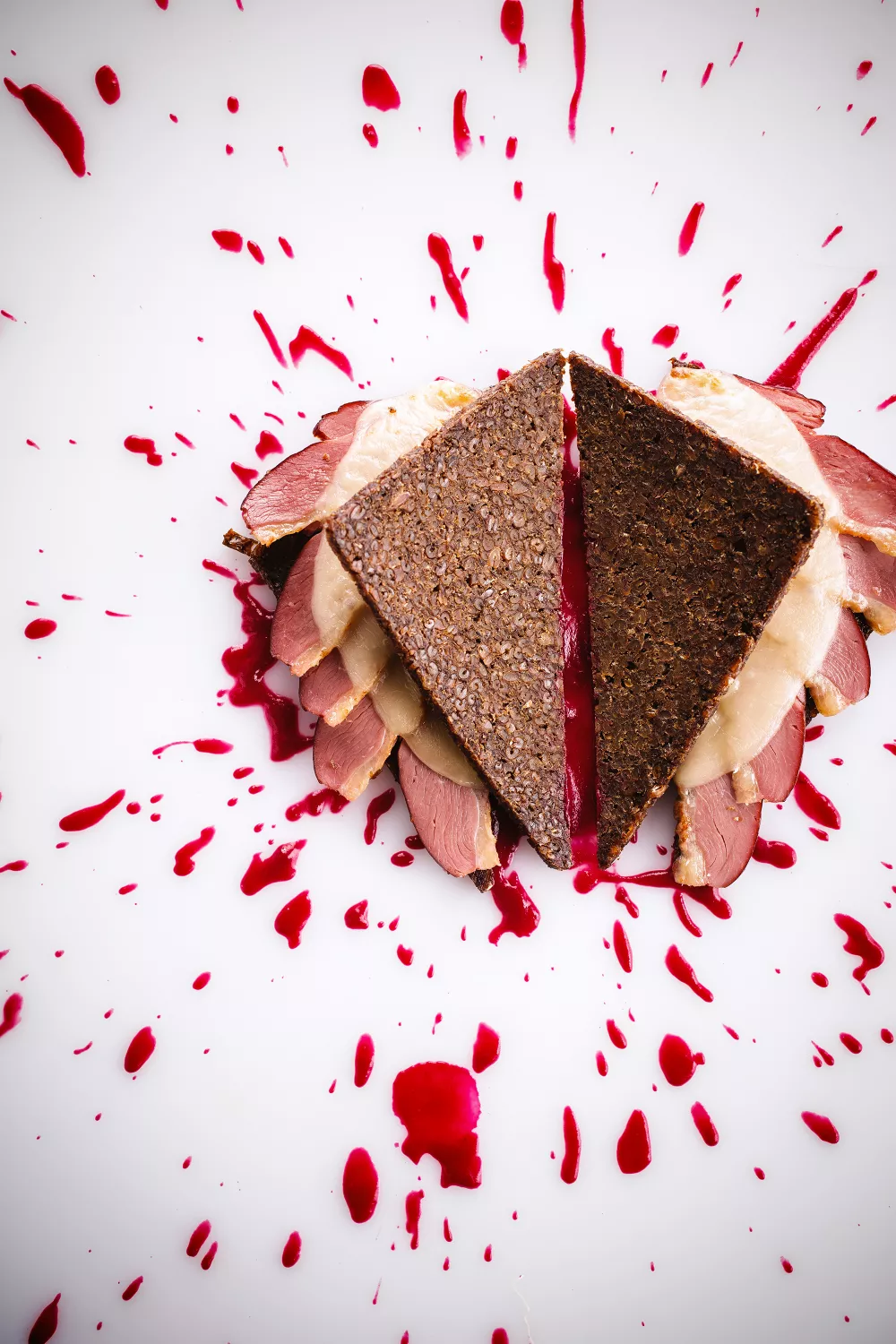 Deze Hitchcroque combineert gerookte eendenfilet met gesmolten Zwitserse kaas op donker brood voor een rijke, hartige bite. Door de kaas langzaam te laten smelten ontstaat een smeuïg beleg dat perfect werkt als luxe lunch of warm borrelhapje. Een lichte besprenkeling van rodebietensap op het bord geeft een frisse, aardse toets en een uitgesproken presentatie voor de herfst en winter.