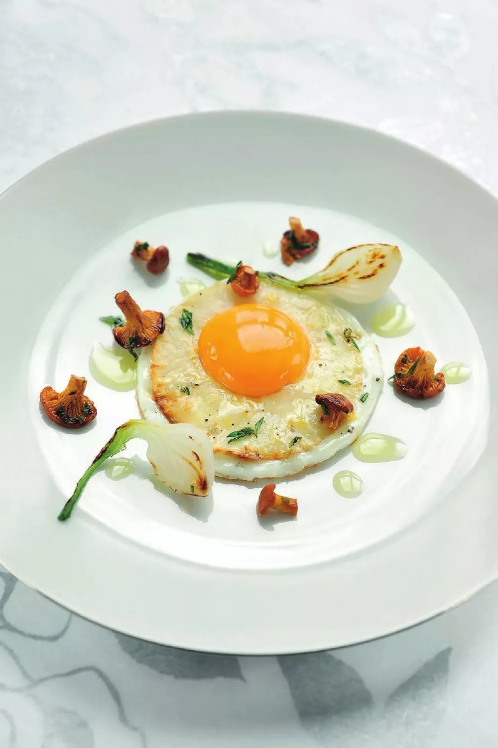 Schik de eieren met de knolselderschijven op de borden en verdeel er de hanenkampaddenstoelen en de uitjes bij. Druppel er nog wat extra vierge olijfolie over.