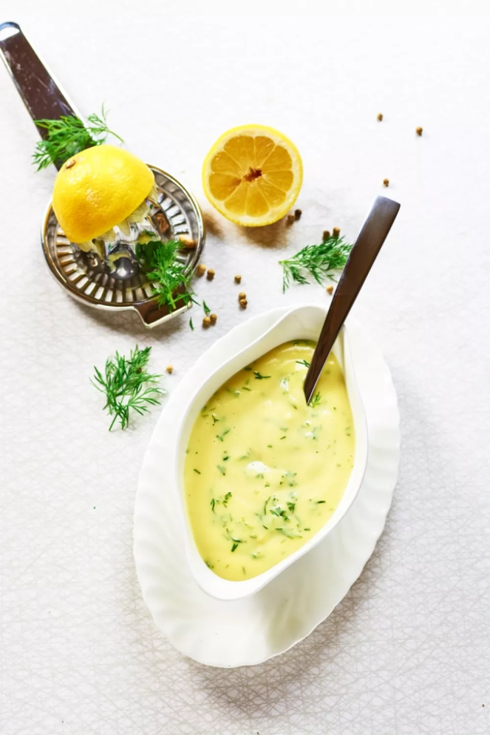 Romige hollandaisesaus van eidooiers en koude boter met een frisse toets van citroensap, perfect bij asperges, vis of een feestelijke brunch. De saus ontstaat door de dooiers zacht te kloppen op laag vuur tot ze stroperig zijn en daarna klontjes koude boter erdoor te roeren tot een zijdezachte emulsie, op smaak gebracht met witte peper en zout.