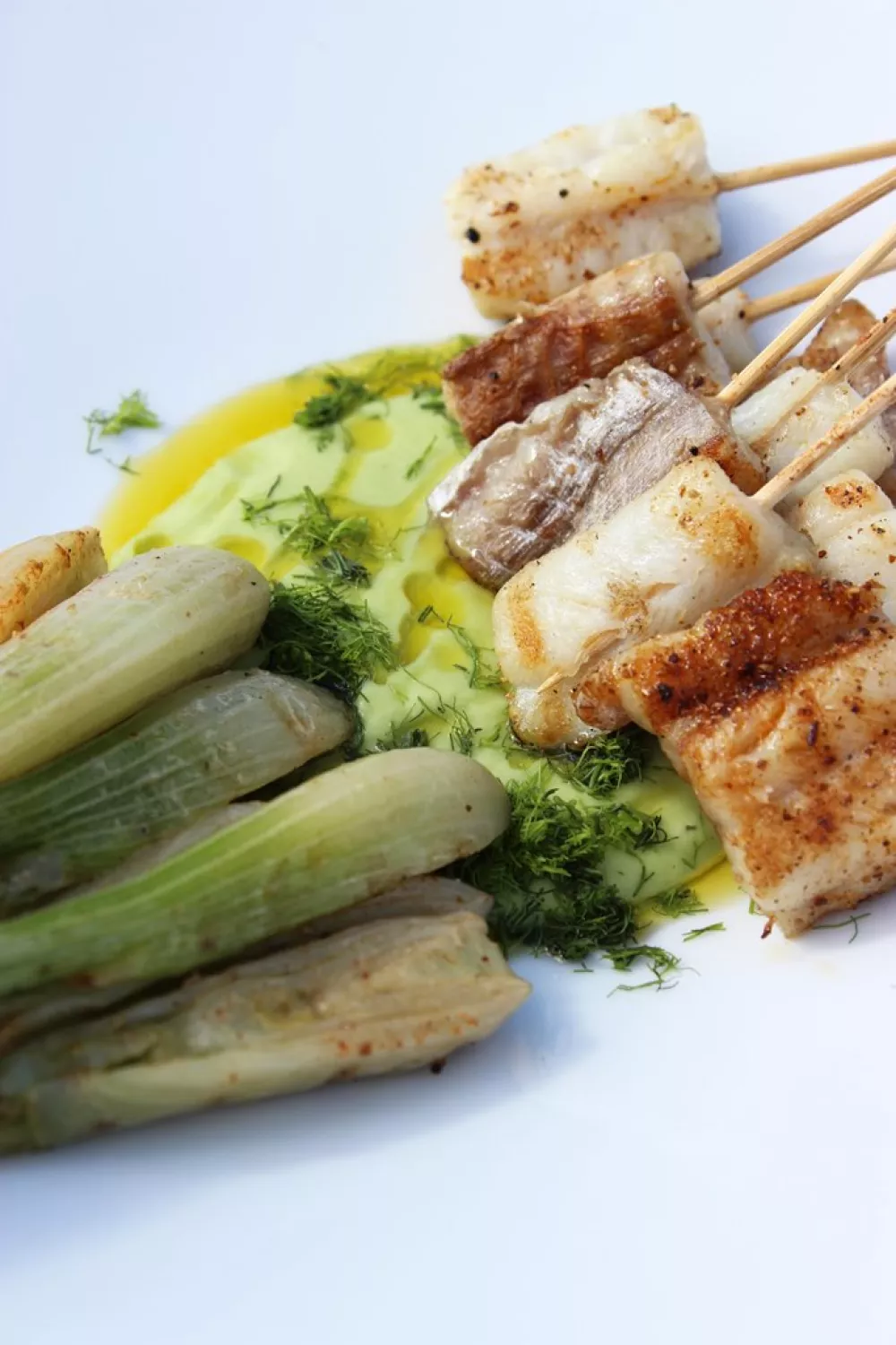 Serveer de spiesjes van hondshaai samen met de venkelpuree en de gegrilde minivenkel.