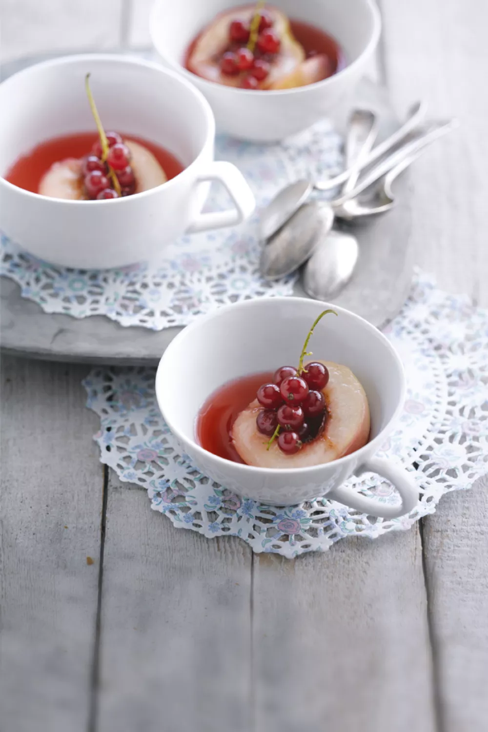 Deze hoogzomersoep van zachte nectarines en frisse rode aalbessen verenigt zonnige zoetheid met een subtiele toets van vanille en limoen. Het fruit wordt kort gestoofd in een lichte suikersiroop met citroentijm en kan zowel warm als gekoeld geserveerd worden als verfrissend dessert of lichte lunch op het terras. Garneer met een bolletje ijs, mascarpone of yoghurt en wat munt voor extra frisheid.