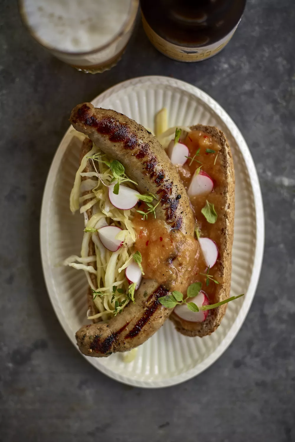 Deze Deluxe hotdog combineert hartige boerenworst met een zoetzure chutney van kweepeer en abrikoos in een rustiek granenbroodje, afgetopt met knapperige koolslaw en frisse radijs. Door de kool kort te marineren met komijn en azijn en de worst goudbruin te bakken ontstaat een perfecte balans tussen zoet, zuur en pittig, ideaal voor een zomerse picknick of een gezellige borrel. Een likje hoeveboter en jonge basilicumblaadjes maken het broodje extra smeuïg en aromatisch.