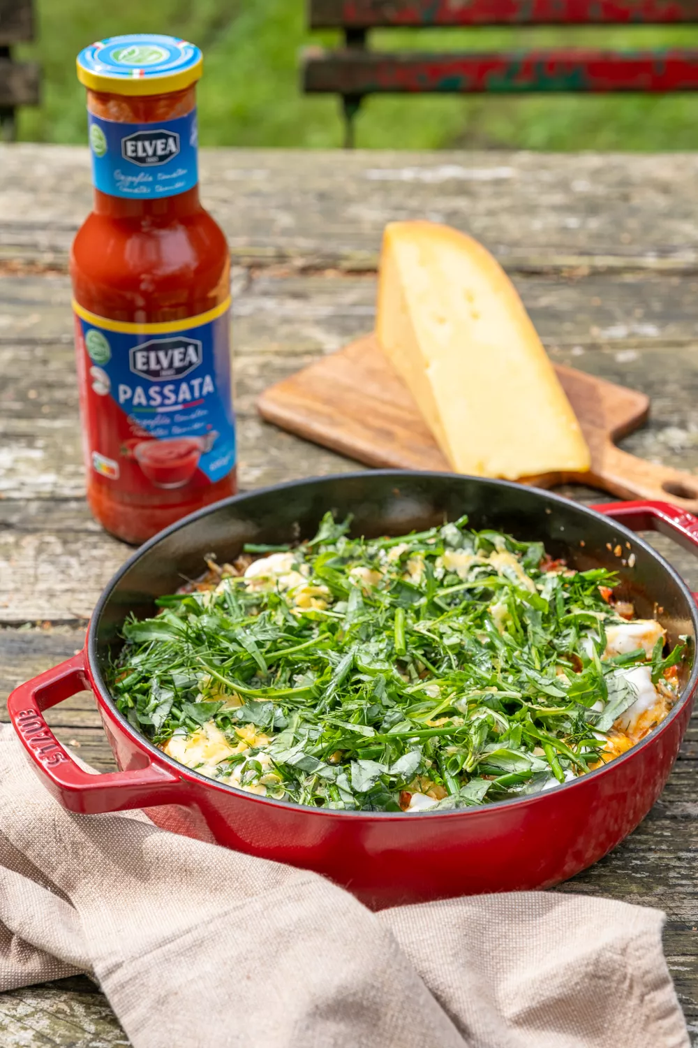 Deze ovengebakken hotpot combineert malse zeeduivel met boterachtige bomba rijst, tomatenpassata, witte wijn en een mix van paprika, courgette en venkel voor een hartige visschotel vol mediterrane toetsen. Rode chili en een scheutje room met geraspte Flandrien Grand Cru geven een pittige, romige finish, terwijl een fris kruidenslaatje van dragon, basilicum, dille en rucola het geheel opfrist. Ideaal voor een gezellig familiediner of zomerse avondmaaltijd die in één pot te bereiden is.