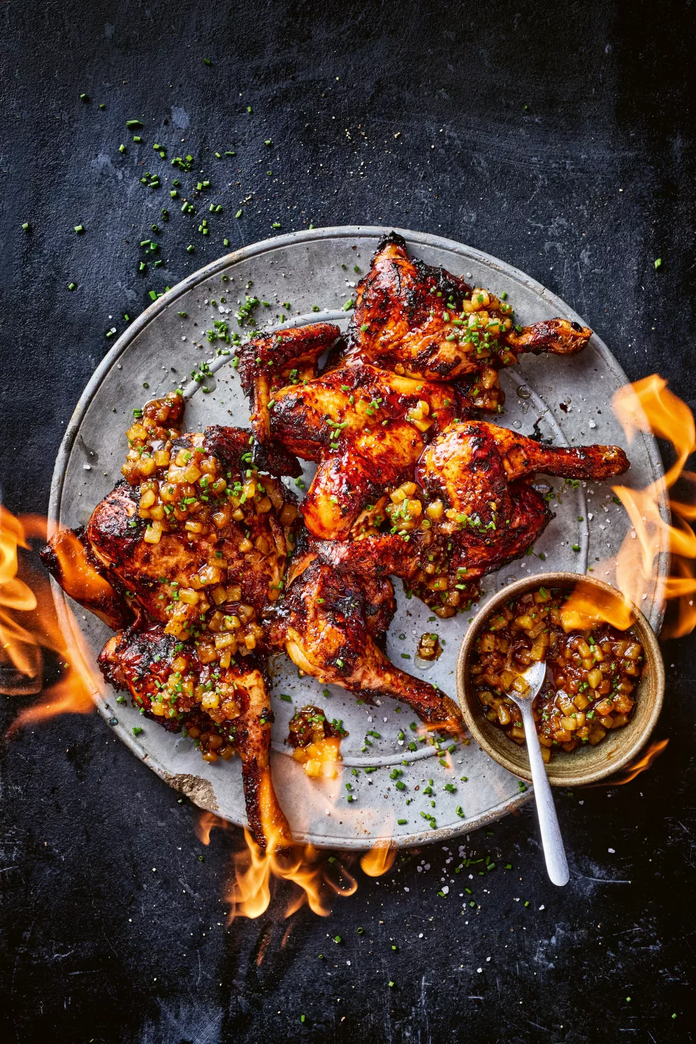 Verwijder met een gevogelteschaarof koksmes de ruggengraatuit de coquelets envouw ze open. Doe de haantjesin een grote zak en voeghier de resterende marinadeaan toe. Sluit de zak (knijp delucht er zo veel mogelijk uit)en verdeel de marinade goedover de haantjes. Laat in dekoeling circa 3 uur marineren.Bereid een BBQ voor op indirectgrillen en verhit deze toteen temperatuur van 170 °C isbereikt. Haal de haantjes uitde marinade (bewaar deze),leg op het rooster en gaardeze in circa 45 minuten totde haantjes een kerntemperatuurhebben bereikt vanminimaal 72 °C in het dijbeen.Kook terwijl de coqueletsgaren de gebruikte marinadein een kleine pan op laag vuurin tot deze stroperig begintte worden. Gebruik de gereduceerdemarinade om dehaantjes in de laatste minutenextra in te kwasten. Haal dehaantjes van de BBQ, serveermet de ananaschutney en garneer met wat bieslook.