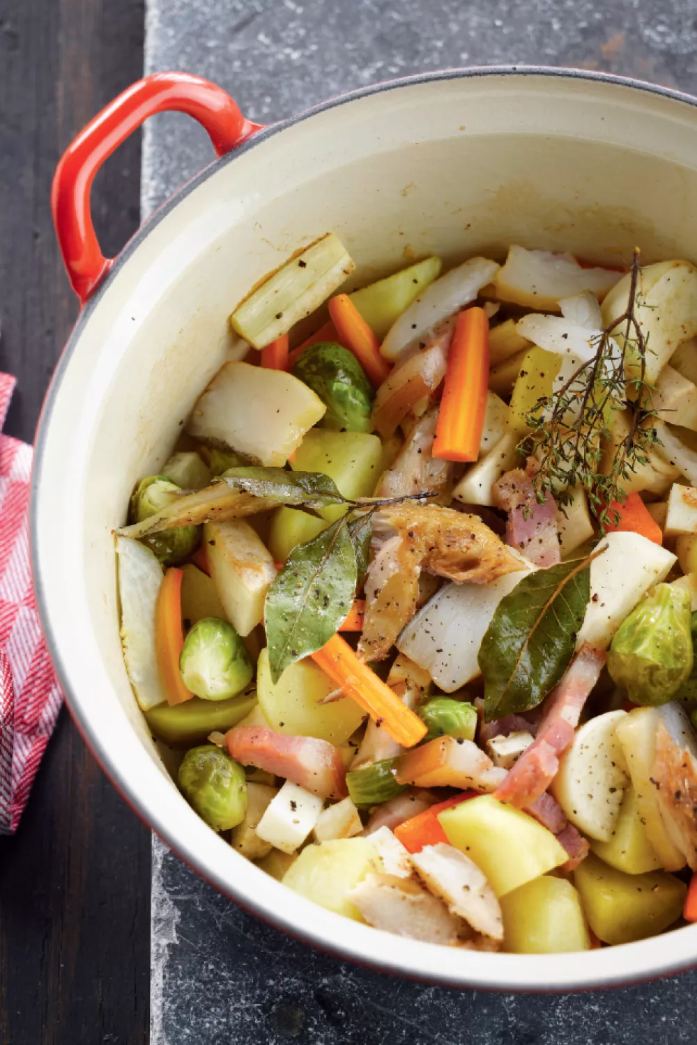 Voeg de spruitjes, het spek, tijm en laurier toe. Stoof goed aan en kruid met gekneusde zwarte peper en zout. Blus met de bouillon en een scheutje witte wijn. Doe een deksel op de stoofpot en laat 45 minuten tot 1 uur zachtjes stoven in de voorverwarmde oven, tot de groenten gaar zijn.
