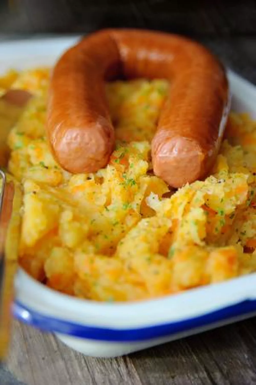 Giet de aardappelen en hutspotgroentes af maar bewaar wat kookvocht van de hutspotgroente. Schep de aardappelen bij de hutspotgroente, stamp fijn. Voeg een beetje kookvocht toe roer alles tot een smeuïge stamppot.