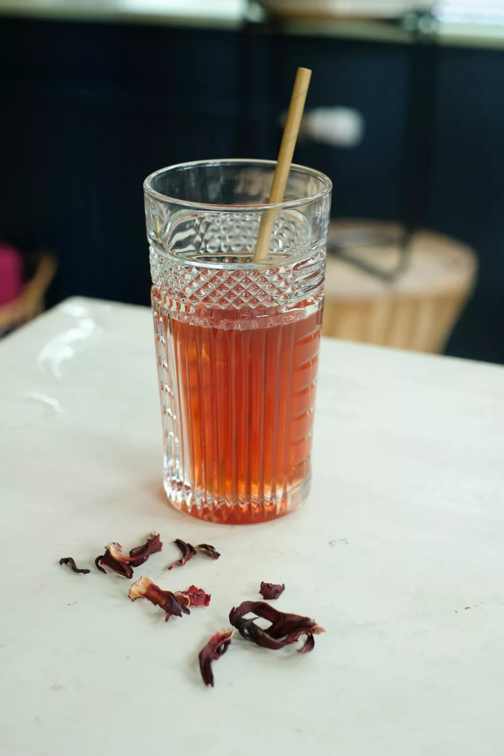 Deze verfrissende ijsthee of iced tea combineert de fruitige zuurheid van gedroogde hibiscus met de subtiele koffienoot en fruitigheid van cascara. Na 8 tot 10 minuten trekken wordt de infusie gekoeld en opgefrist met lambiek, wat zorgt voor een licht bruisende, friszure smaak. Perfect voor zomerse picknicks, borrels of als elegante dorstlesser op het terras.