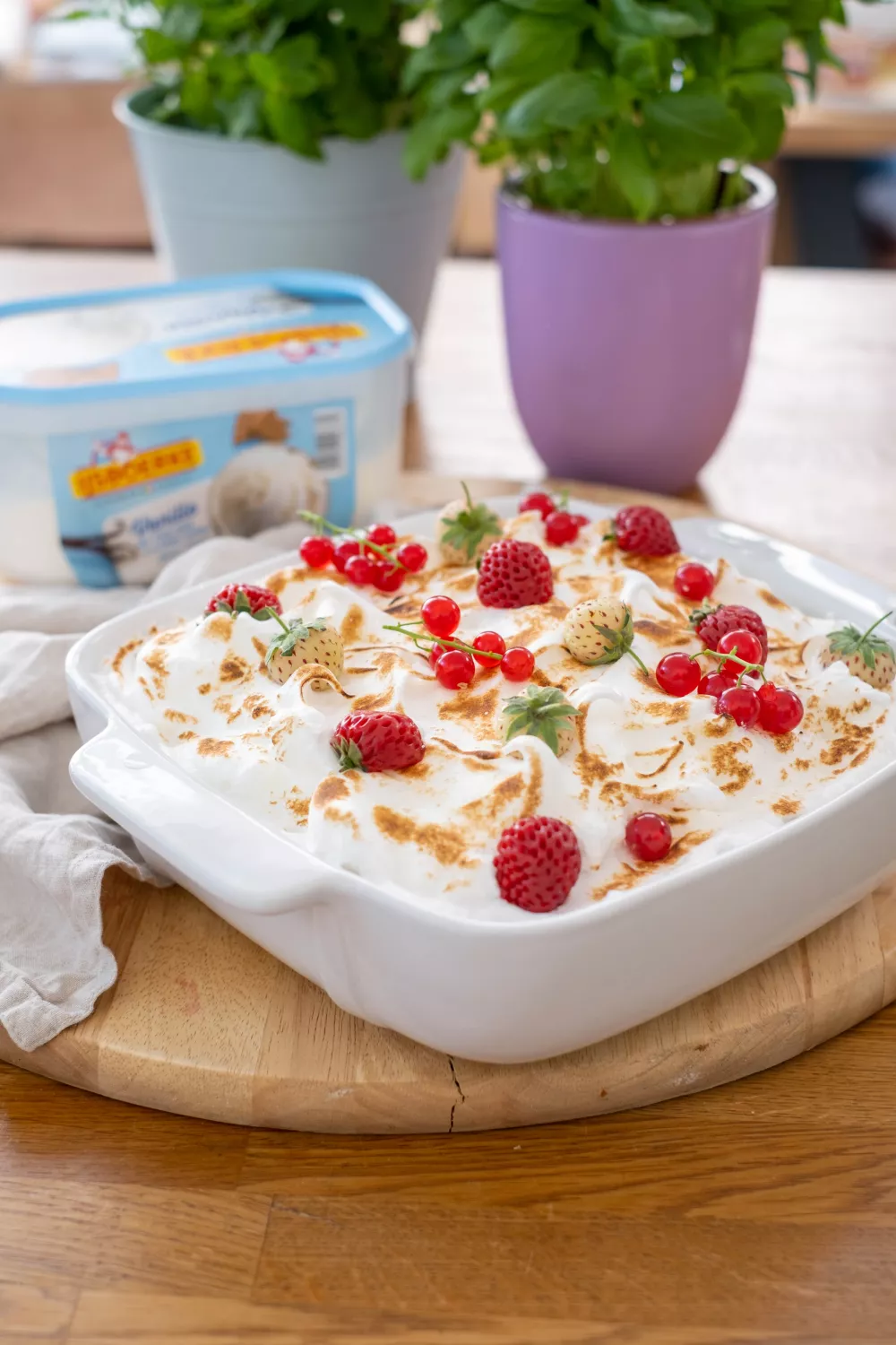 Deze luchtige ijscake combineert zachte plakjes cake, romig vanille-ijs en bloemige vlierbloesemsiroop tot een feestelijk zomers dessert. Opgeklopte eiwitten krijgen een goudbruine meringuelaag door kort af te branden met een brandertje, wat zorgt voor een knapperige buitenkant en een fluweelzacht binnenste. Makkelijk te bereiden en ideaal om indruk te maken bij een diner of picknick.