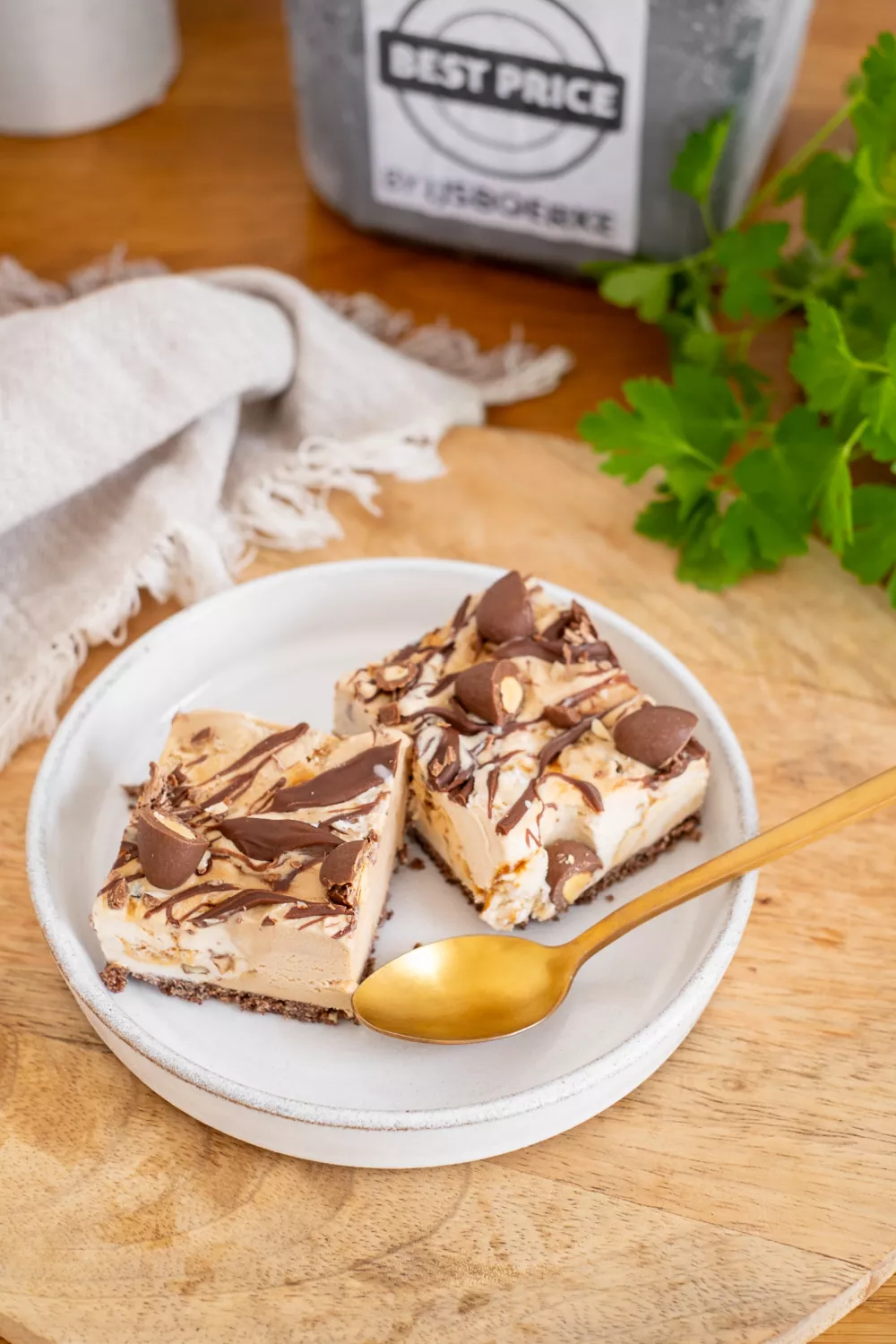 Neem een vierkante bakvorm en bekleed deze met een laagje bakpapier. Verdeel er de fijngemalen coco pops over en druk goed aan. Schep hierbovenop de bollen walnootijs en de bollen hazelnootijs. Druk goed aan en verdeel er de chocopasta en de nootjes met chocolade over.