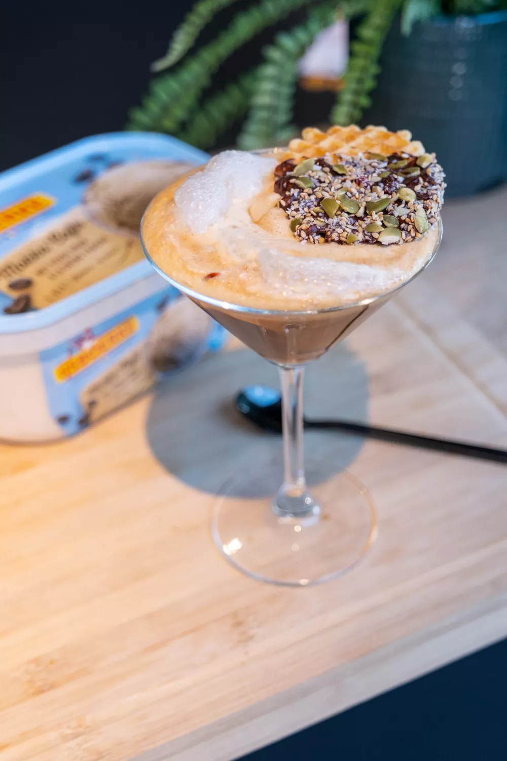 Een verfrissende espresso tonic met romig koffie-ijs en een krokant chocoladewafeltje, perfect als zomerse cocktail bij een borrel. De combinatie van ijskoude tonic, hete espresso en zacht koffie-ijs geeft een spannend samenspel van bitter en zoet, terwijl wafeltjes die in gesmolten pure chocolade en een mix van kokosschilfers, pistachenootjes en veenbessen zijn gedipt zorgen voor textuur en kleur. Snel te maken door chocolade au bain marie te smelten en de glazen te vullen.