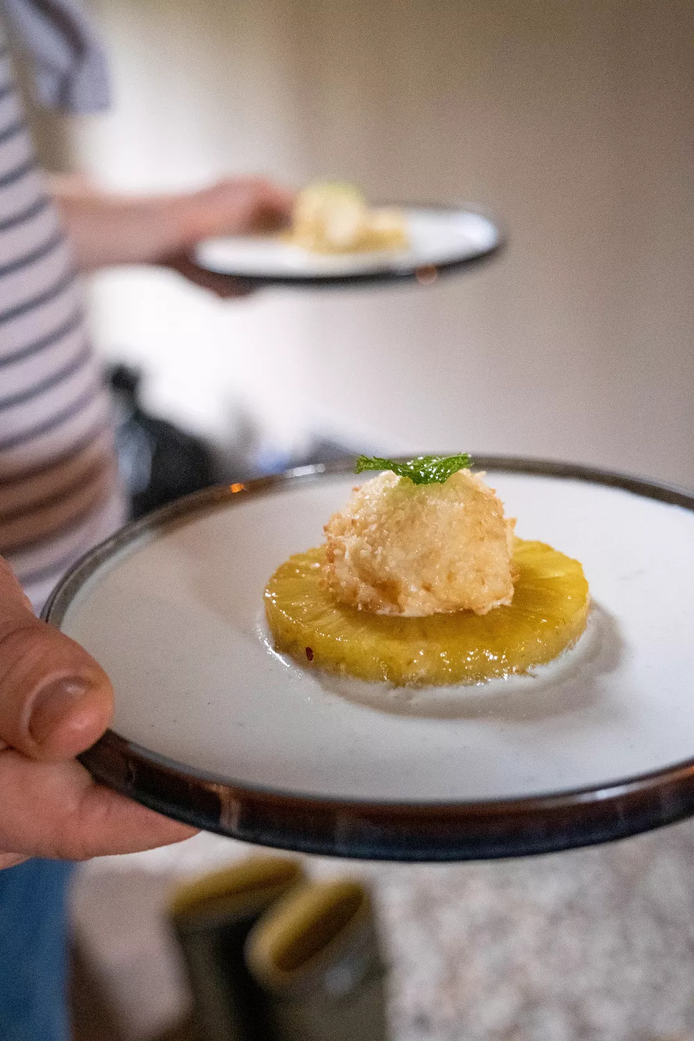 Frituur de ijskroketten gedurende 1 minuut op 180 graden. Schik de schijven ananas mooi op bordjes en lepel er de rijstcrème rond. Werk af met de ijskroketten.