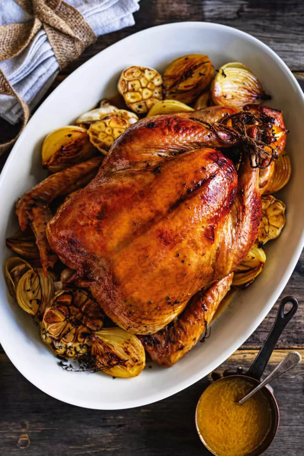 Leg de kalkoen met de ui en knoflook op een grote schaal. Giet het braadvocht in een kleine pan, giet er de resterende bouillon bij en breng aan de kook. Laat zachtjes koken tot de jus tot de helft is ingekookt. Snijd de kalkoen aan en serveer, besprenkeld met de jus.