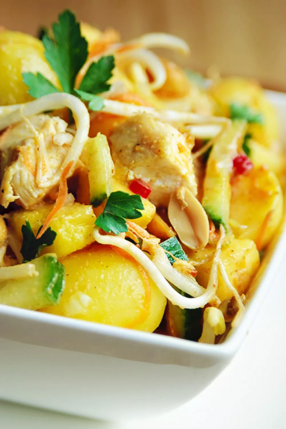 Frisse Indonesische kipsalade vol zoete ananas, romige pindadressing en knapperige groenten die samen een hartige en licht pittige Aziatische smaak geven. Gegrilde of gebakken kip en gekookte krieltjes worden gemengd met komkommer, geraspte wortel, lente-uitjes, gember en chili voor textuur en pit, terwijl de dressing van pindakaas, sojasaus, sesamolie en limoen alles verzacht. Perfect als lichte lunch, zomers bij de barbecue of als kleurrijk bijgerecht op kamertemperatuur.