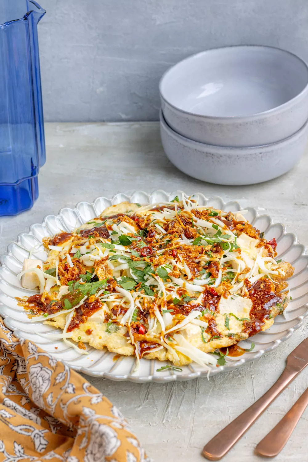 Deze Indonesische tofu-omelet combineert luchtig ei met blokjes stevige tofu en een rijke ketjap notensaus op basis van cashewpasta, petis en limoen. Kort bakken in de wok en daarna grillen in de oven geeft een goudbruine textuur terwijl pittige chili en gebakken uitjes zorgen voor die typische Aziatische smaak. Perfect als snelle doordeweekse lunch, borrelhap of lichte zomerse avondmaaltijd.