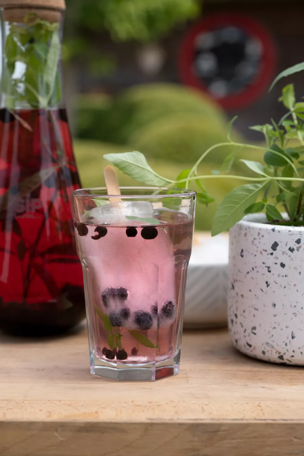 Een verfrissend infusiewater met diepvries blauwe bessen, milde honing en aromatische verveine, ideaal voor zomerse picknicks, terrasmomenten of een lichte brunch. Meng simpelweg water, bessen, honing en takjes verveine en laat even trekken voor een fruitig, zachtzoet drankje zonder te koken. Voor extra flair voeg je waterijsjes van water, limoensap en blauwe bessen toe voor kleur en extra koelte.