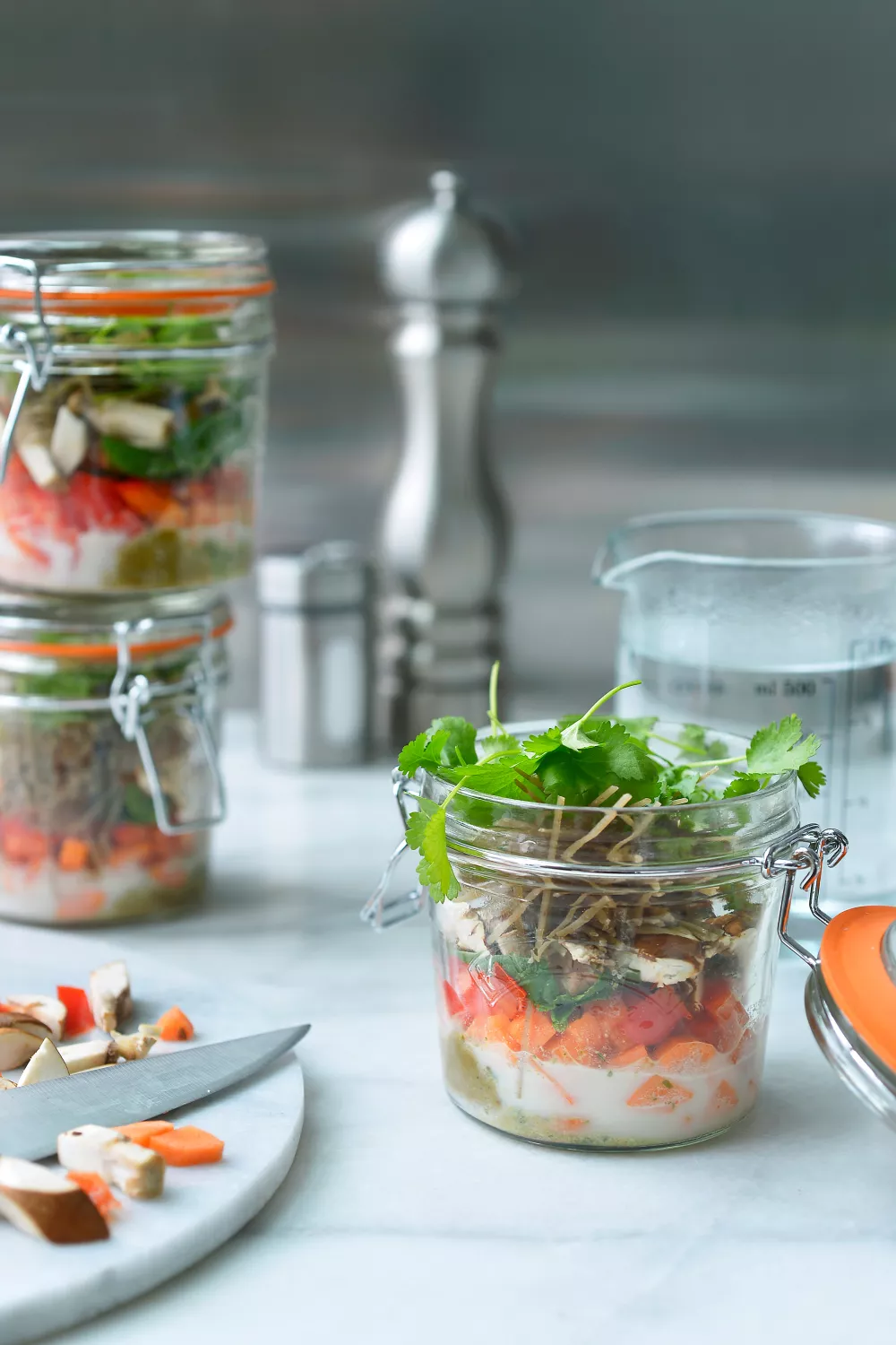 Schil de wortel en snijd alle groentjes zeer fijn. Neem een weckpot (van 500 ml) en begin onderaan met de kokosmelk, dan de currypasta, en vervolgens de verse gember en het bouillonpoeder. Proef zeker op voorhand van je currypasta en pas de hoeveelheid aan afhankelijk van hoe pikant het is. Als volgende laag leg je je gesneden groentjes. Leg daar bovenop de noodles en werk af met de verse koriander. Sluit de weckpot en neem hem mee naar je werk.