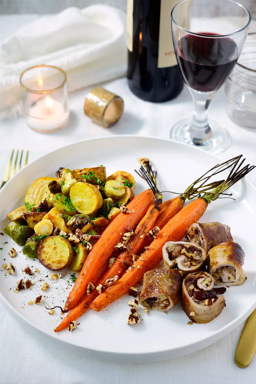 Involtini van kalf met pecannoten en dadels, krieltjes en wintergroenten