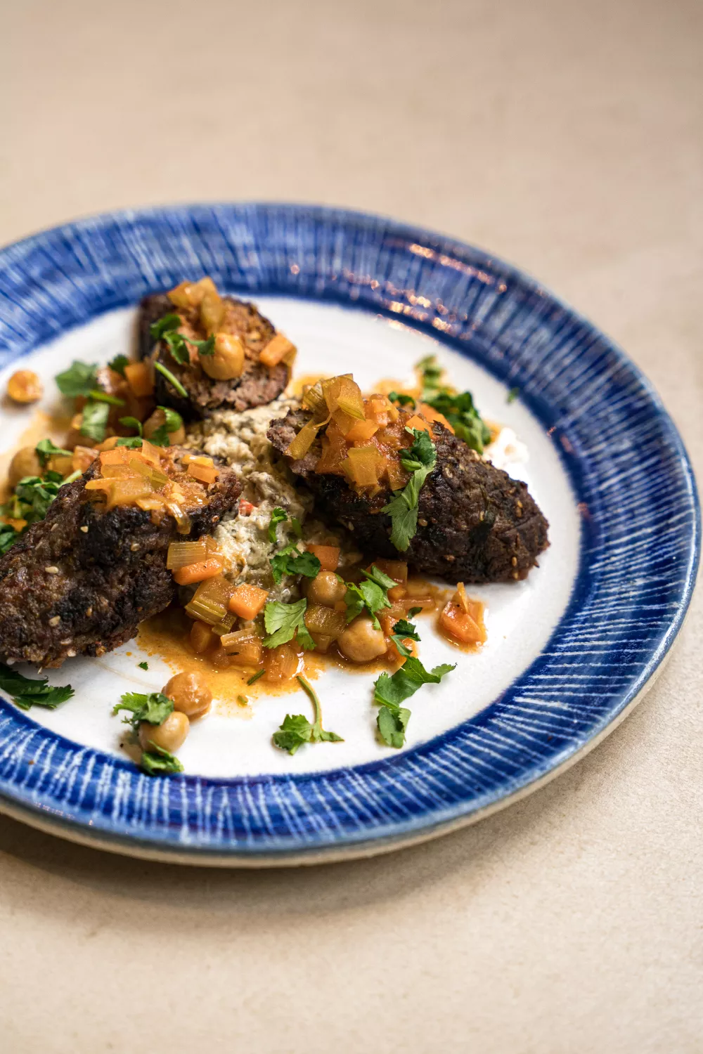 Zomerse, Middenoosterse smaken komen samen in deze Iraanse lamsspiesjes met romige baba ganoush van gegrilde aubergine, tahini en citroen. Kruidig lamsgehakt met za'atar en geroosterde komijn wordt gegrild op de barbecue en geserveerd met een rijke groentesaus met saffraan en het umami van garnalenkoppen. Perfect voor een feestelijk diner of een gezellige zomeravond.