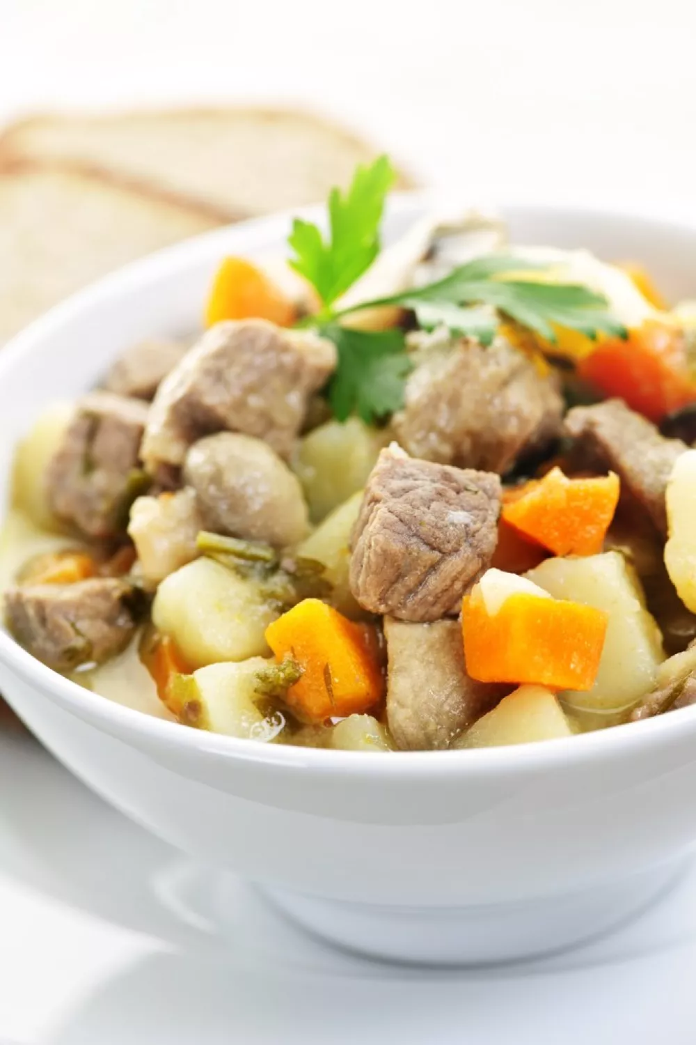 Deze hartige Irish stew is een troostrijke stoofpot van mals lamsvlees, aardappelen en wintergroenten zoals knolselder, spruitjes en wortel. Langzaam pruttelen in bouillon trekt smaken samen tot een rijke, huiselijke maaltijd ideaal voor koude avonden of een zondagse lunch. Werk af met Engelse saus, mosterd en verse peterselie voor extra diepte en frisheid.