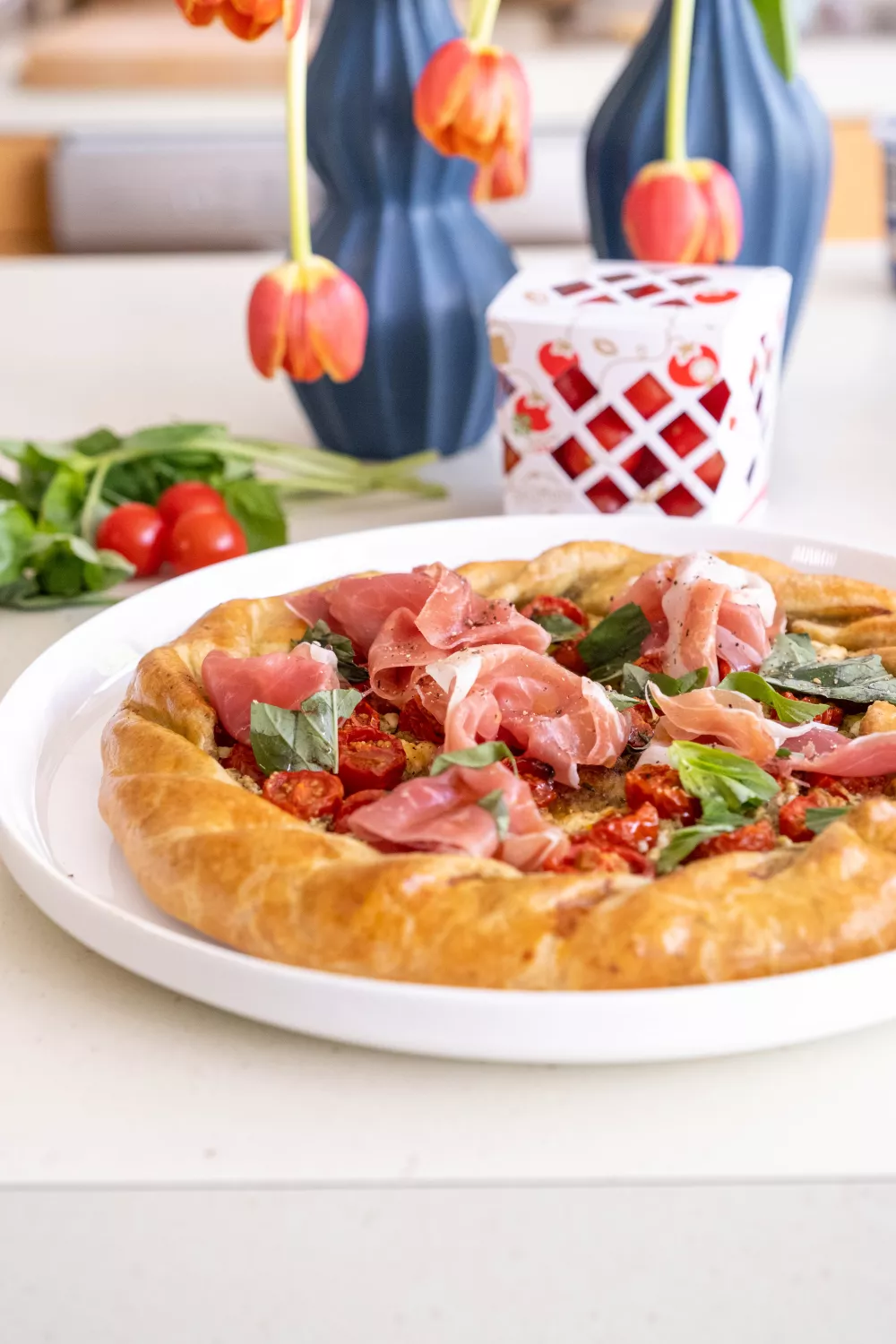 Bak de galette 35 à 40 minuten alvorens te serveren. Werk de hartige taart nog af met enkele sneetjes prosciutto, basilicum en olijfolie.