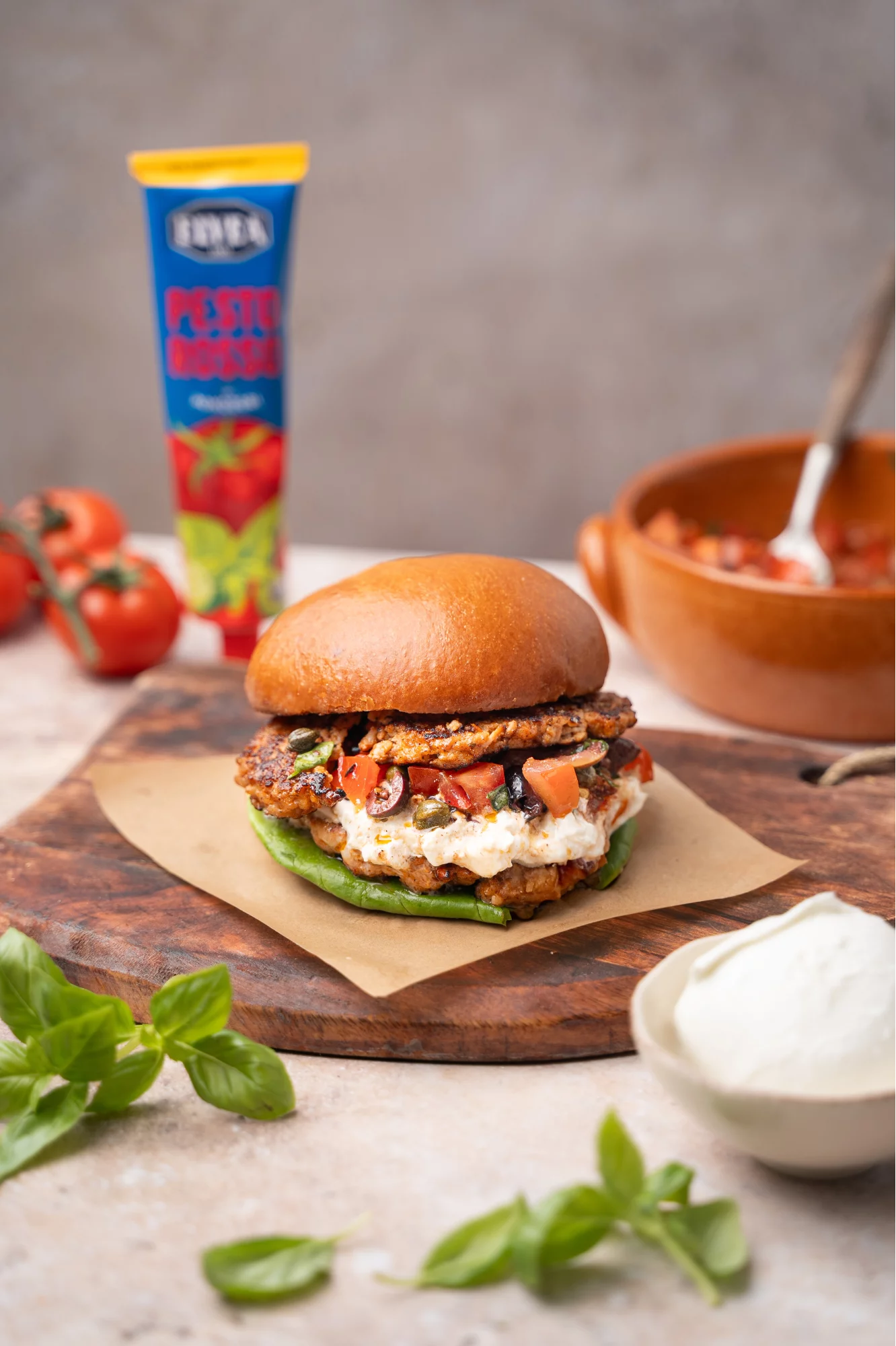 Deze Italiaanse smashburgers met pesto rosso combineren het beste van streetfood en mediterrane smaken. Sappige kipburgers worden afgewerkt met romige burrata, frisse tomaatsalsa en een verrassende artisjokmayo. Alles wordt geserveerd op een luchtige briochebun voor een perfecte balans tussen hartig en fris. Een luxueuze burger met een Italiaanse twist.
