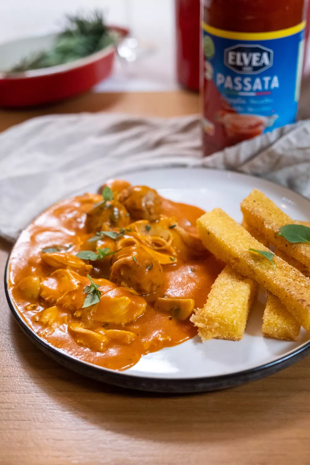Romige Italiaanse vol au vent met huisgemaakte polentafrietjes combineert zachte kip, sappige kalfsgehaktballetjes en gebakken champignons in een rijke tomatenroom verrijkt met Madeira, rozemarijn en Parmezaanse kaas. De polenta wordt gekookt, opgesteven en in frietjes gesneden om goudbruin in olijfolie te bakken, terwijl de saus met een roux, passata en een scheutje room langzaam indikt. Ideaal comfortfood voor een gezellig weekenddiner of een warme herfstmaaltijd.