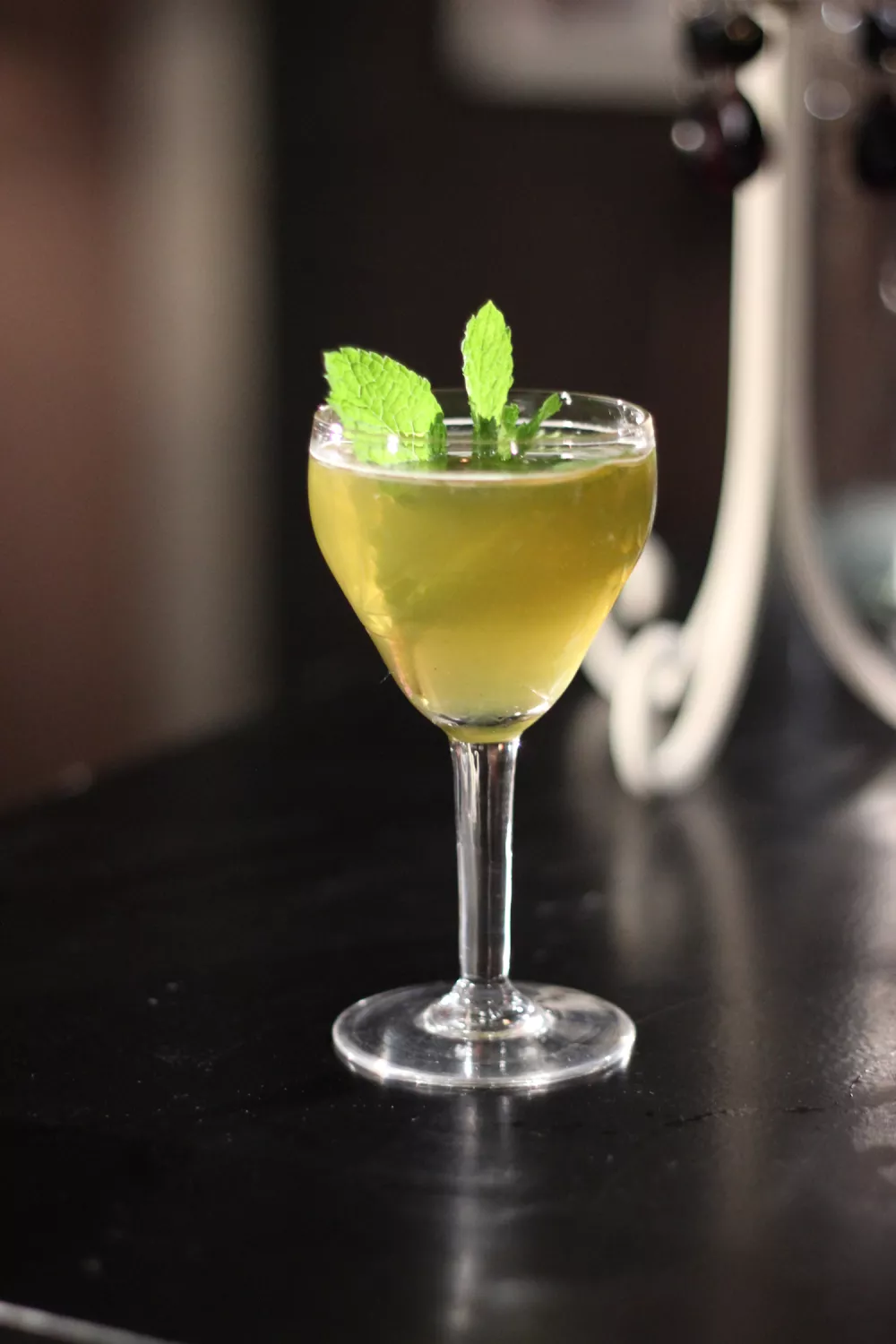 Strain de cocktail in een voorgekoeld glas en werk af met enkele blaadjes munt.