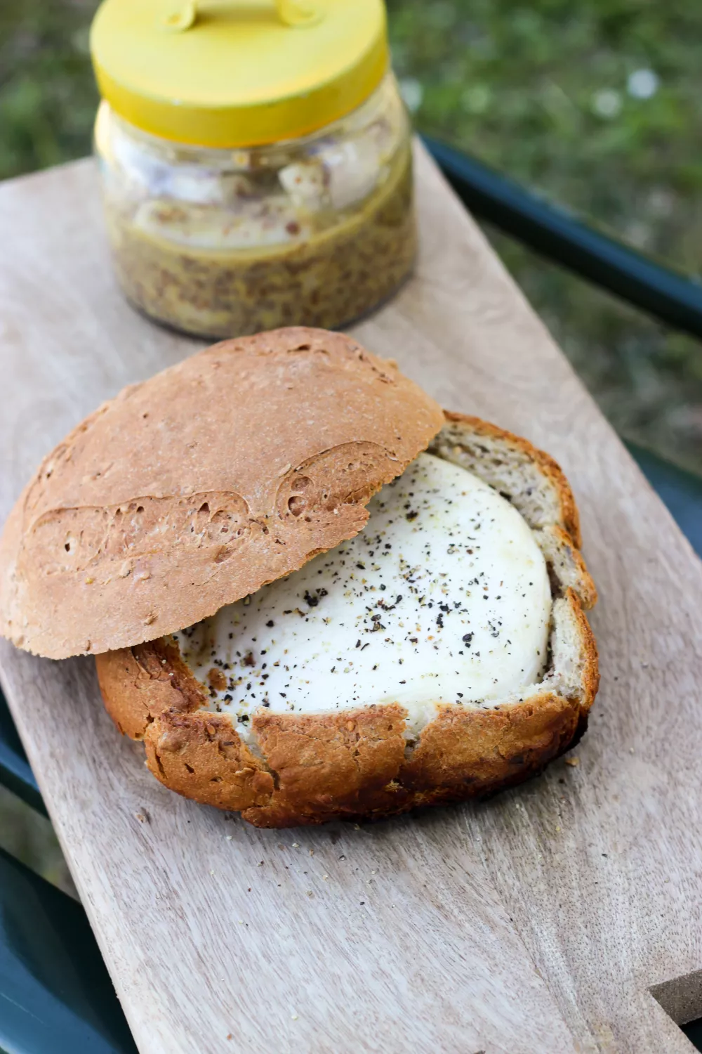 Snijd de bovenkant van het kleine ronde broodje. Haal de vulling er uit en leg het kaasje er in. Pak de onderkant van het broodje in met een laagje aluminiumfolie. Laat de kaas mooi smelten in het brood op de barbecue.