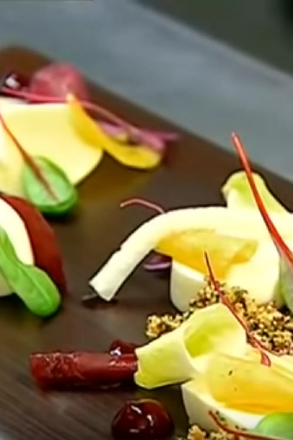 Een verfijnde kaaskroket in Hof van Cleve stijl: zachte Gruyèreflan met een krokante Parmezaan en geroosterde notencrumble, frisse ingelegde bietjes en umami van Gandaham. Technieken als gelificatie, drogen en schuim geven dit borrelhapje restaurantwaarde. Perfect voor feestelijke diners in de herfst en winter.