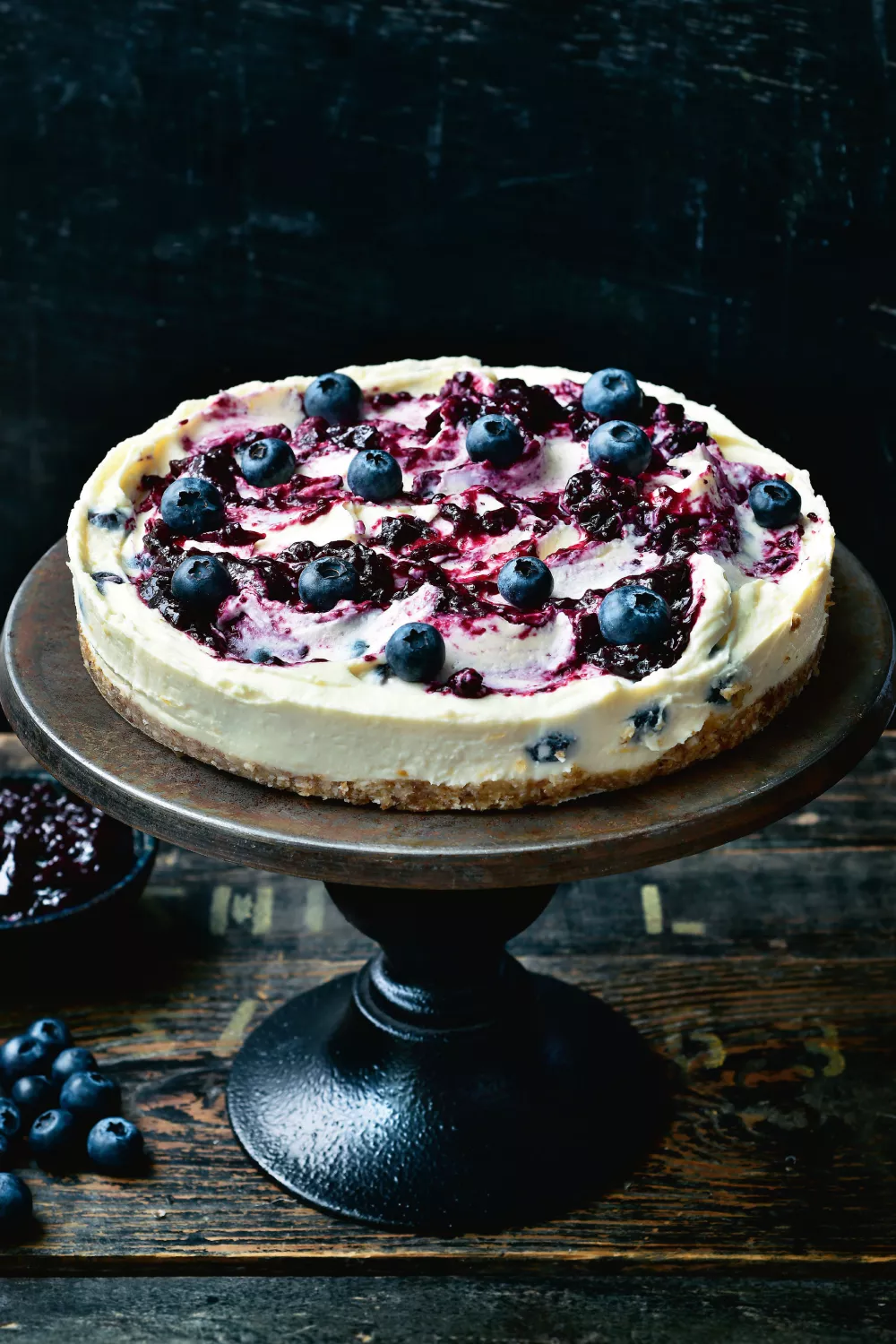 Verdeel het mengsel over de zachte notenbodem. Je hoeft het niet perfect glad te strijken. Plaats de taart in de koelkast. Verdeel na een halfuurtje de bosbessensaus over de taart en maak rustieke swirl-bewegingen. Laat de taart nu volledig opstijven. Dit duurt 2 à 3 uur.