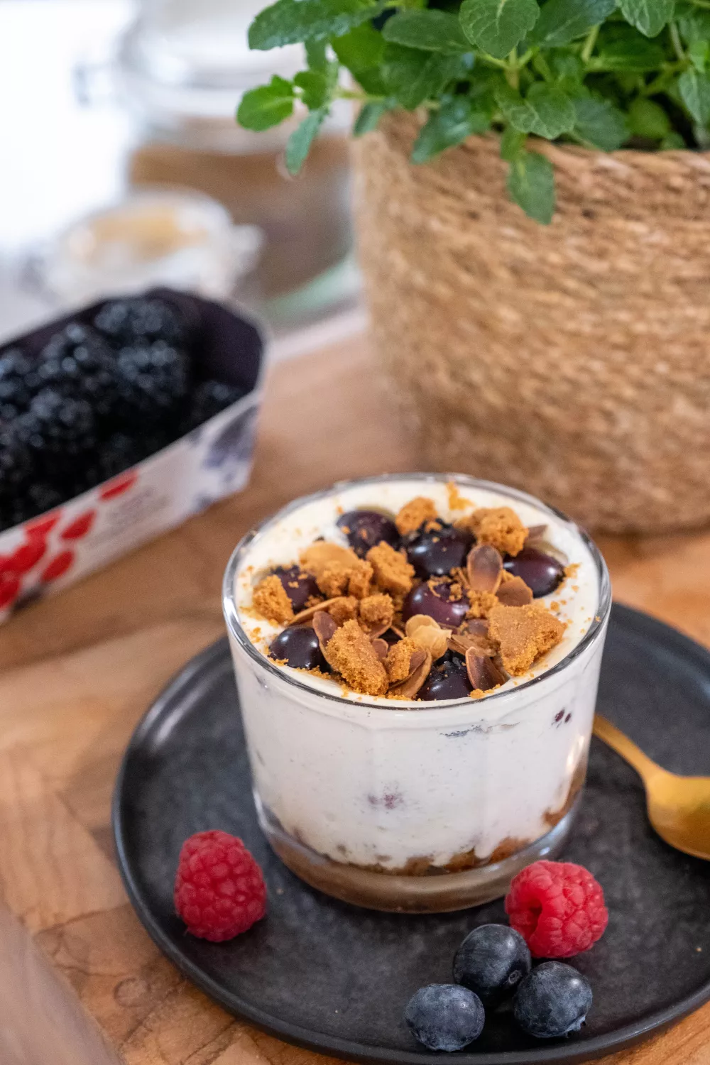 Meng de suikervervanger geleidelijk aan door de verse kaas. Roer er vervolgens de eieren en het vanillepoeder doorheen. Schep tot slot het gemengde rode fruit voorzichtig door de verse kaas. Neem vuurvaste schaaltjes en verkruimel boven elk schaaltje 2 speculaasjes. Verdeel vervolgens het beslag over de schaaltjes, schik er nog een paar extra blauwe bessen bovenop en plaats ze 10 minuten in de oven.