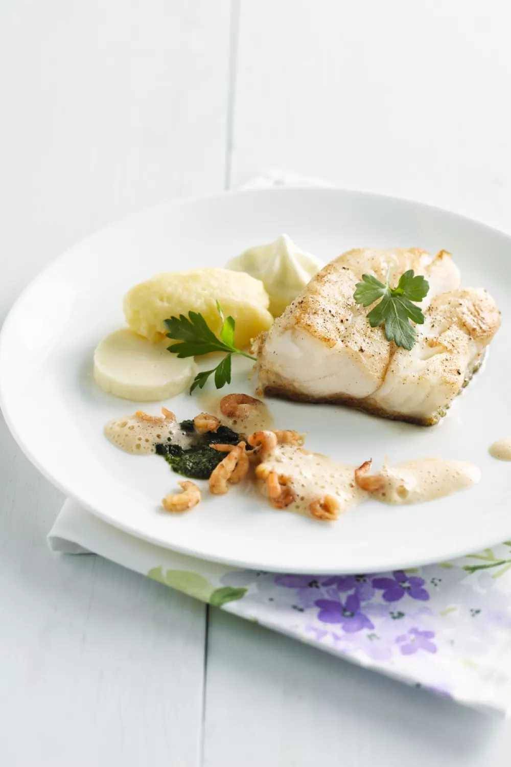 Kabeljauw in een eigentijds jasje met frisse peterseliewortelgelei, romige peterselieaardappelpuree uit de sifon en handgepelde grijze garnalen. Dit verfijnde visgerecht combineert bakken en ovengaring met technieken als gelei bereiden en het gebruik van een sifon, aangevuld met aardappelpuree en een schuimende kalfsfond voor een feestelijk voorjaarsmenu.