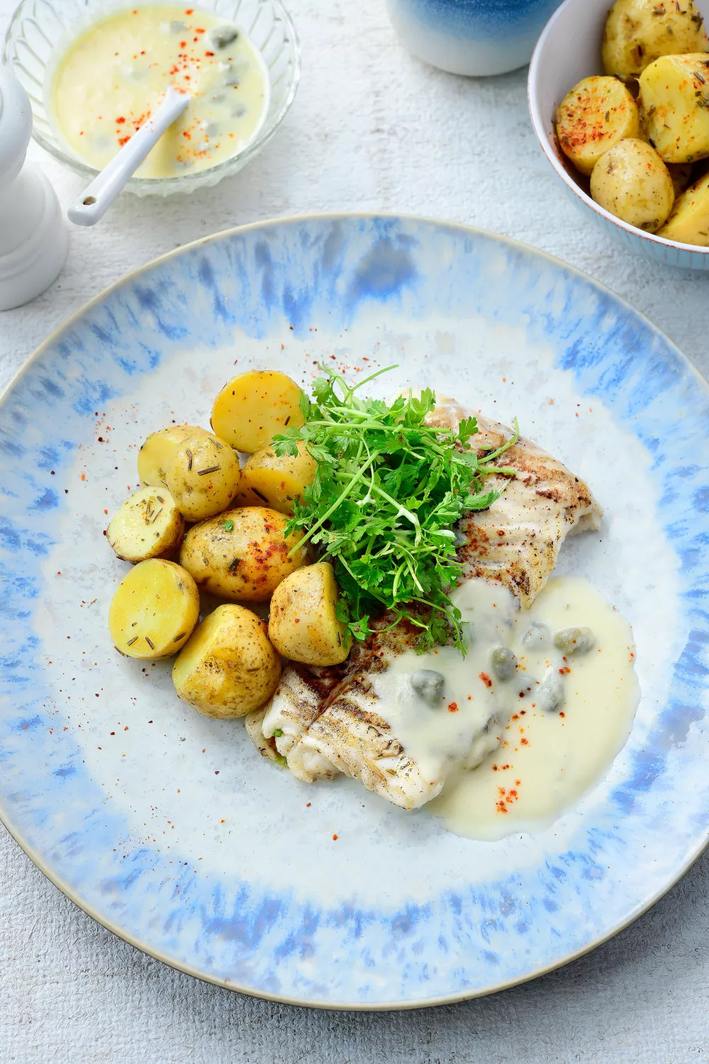 Kabeljauw in citroen-botersaus met gebakken krieltjes