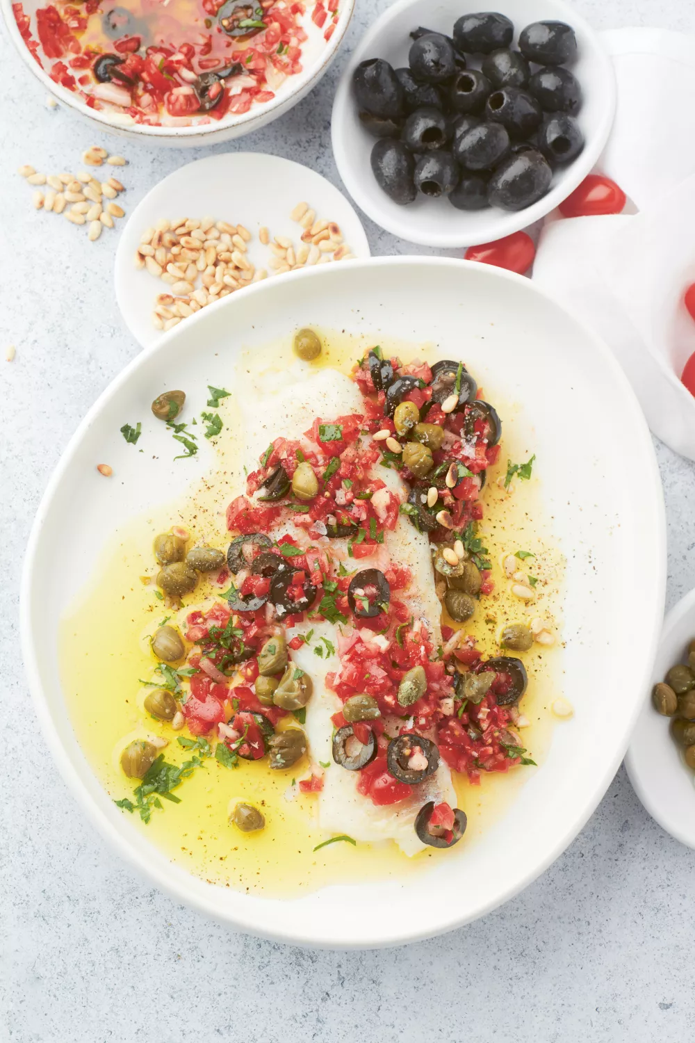 Snijd ondertussen de groenten fijn om op de vis te serveren. Verwijder het zaadbed van de puntpaprika en pel de sjalot. Snijd beide in kleine stukjes, doe dat ook met de kerstomaatjes. Snijd de olijven in ringetjes en hak de peterselie fijn. Meng alles en voeg er ook de kappertjes, het sap van de andere helft van de citroen, de rest van de olijfolie en flink wat zwarte peper aan toe. Eventueel kan je ook wat fijngehakte knoflook toevoegen.